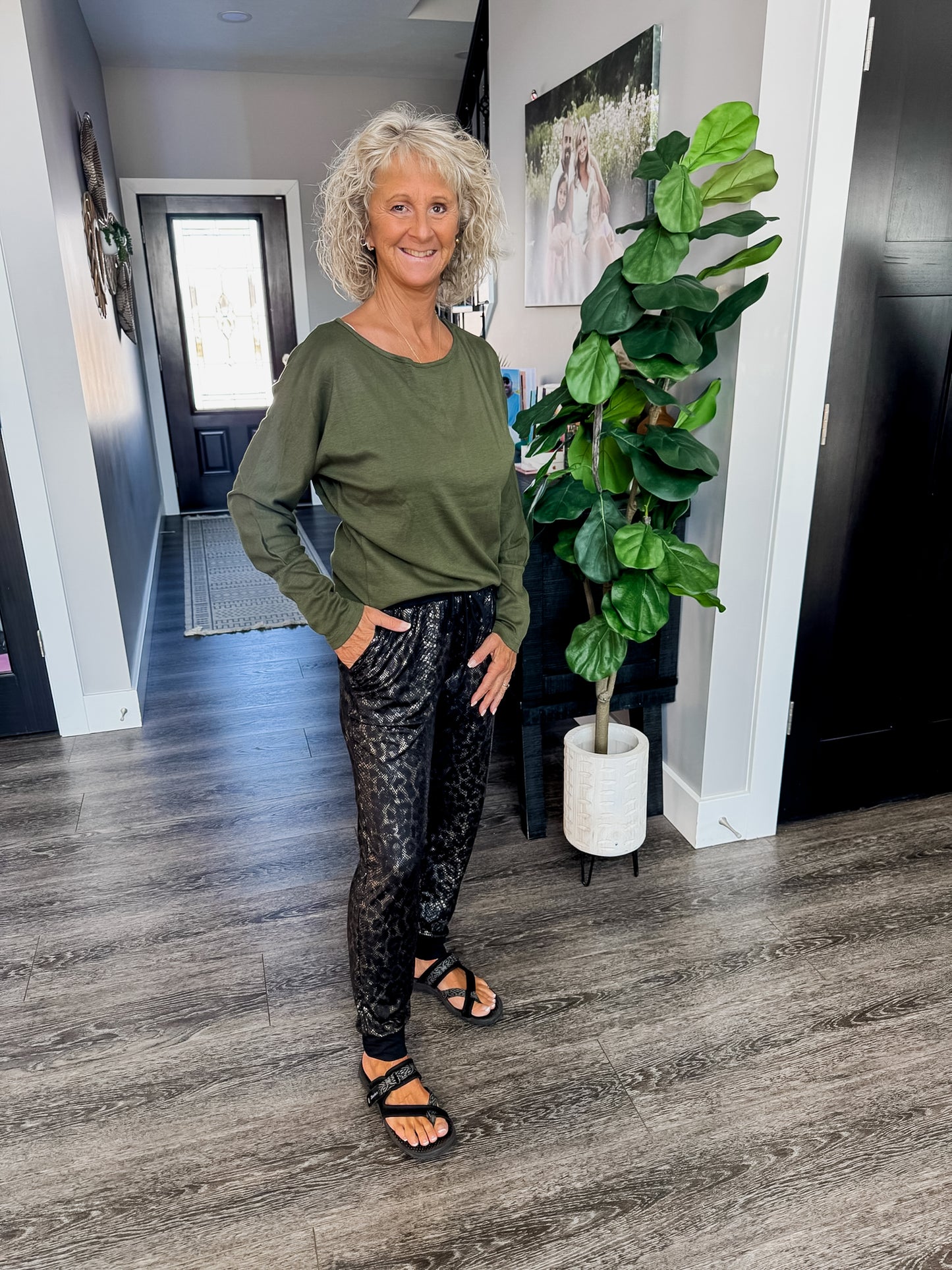 Edgy meets effortless in the Street Style Safari Joggers. Designed with a subtle allover animal print and a sleek tapered fit, these black and gold joggers bring just the right amount of bold to your everyday look. The elastic waistband and cuffed ankles keep them comfortable and flattering, making them perfect for everything from errands to off-duty days.