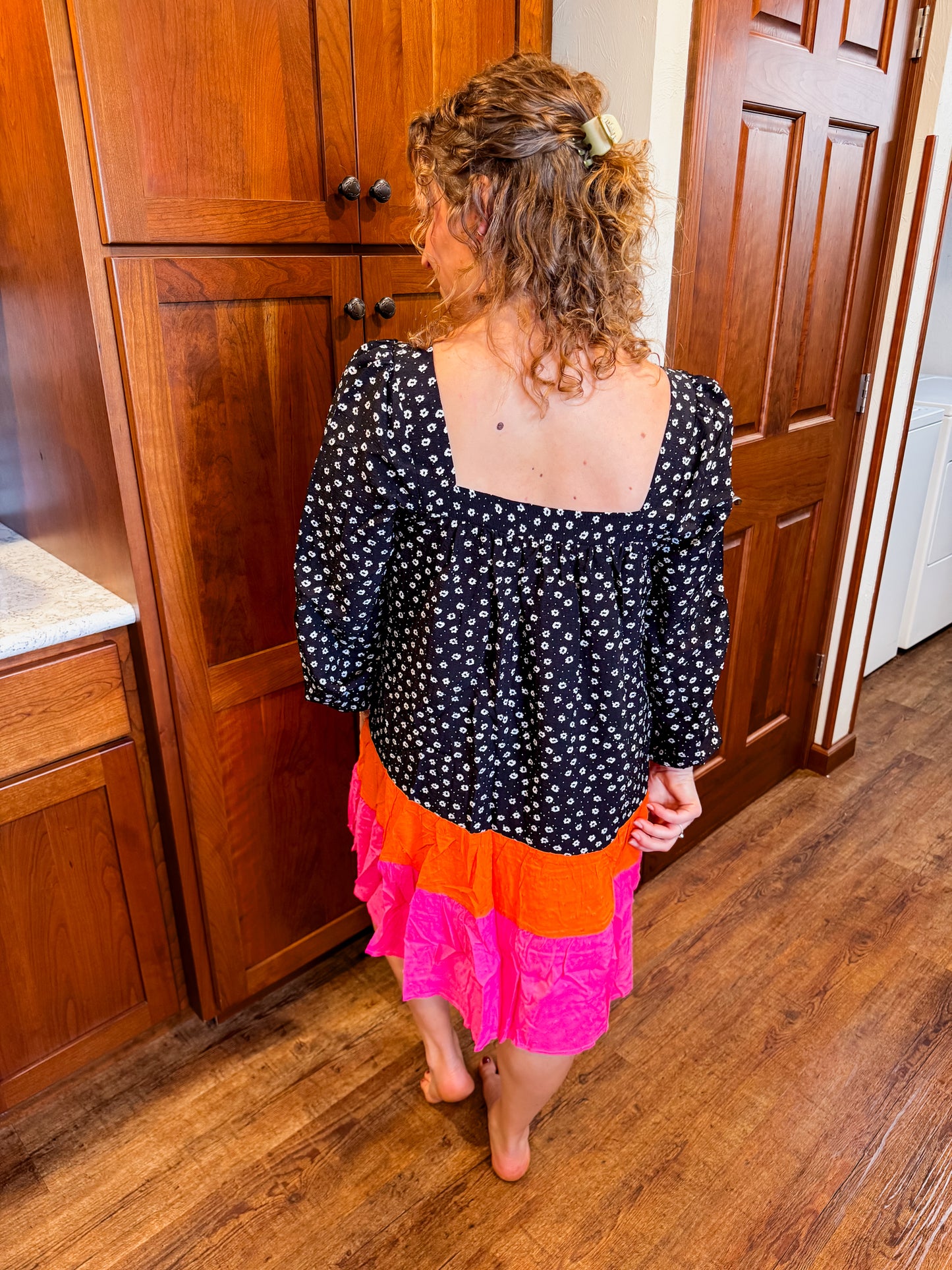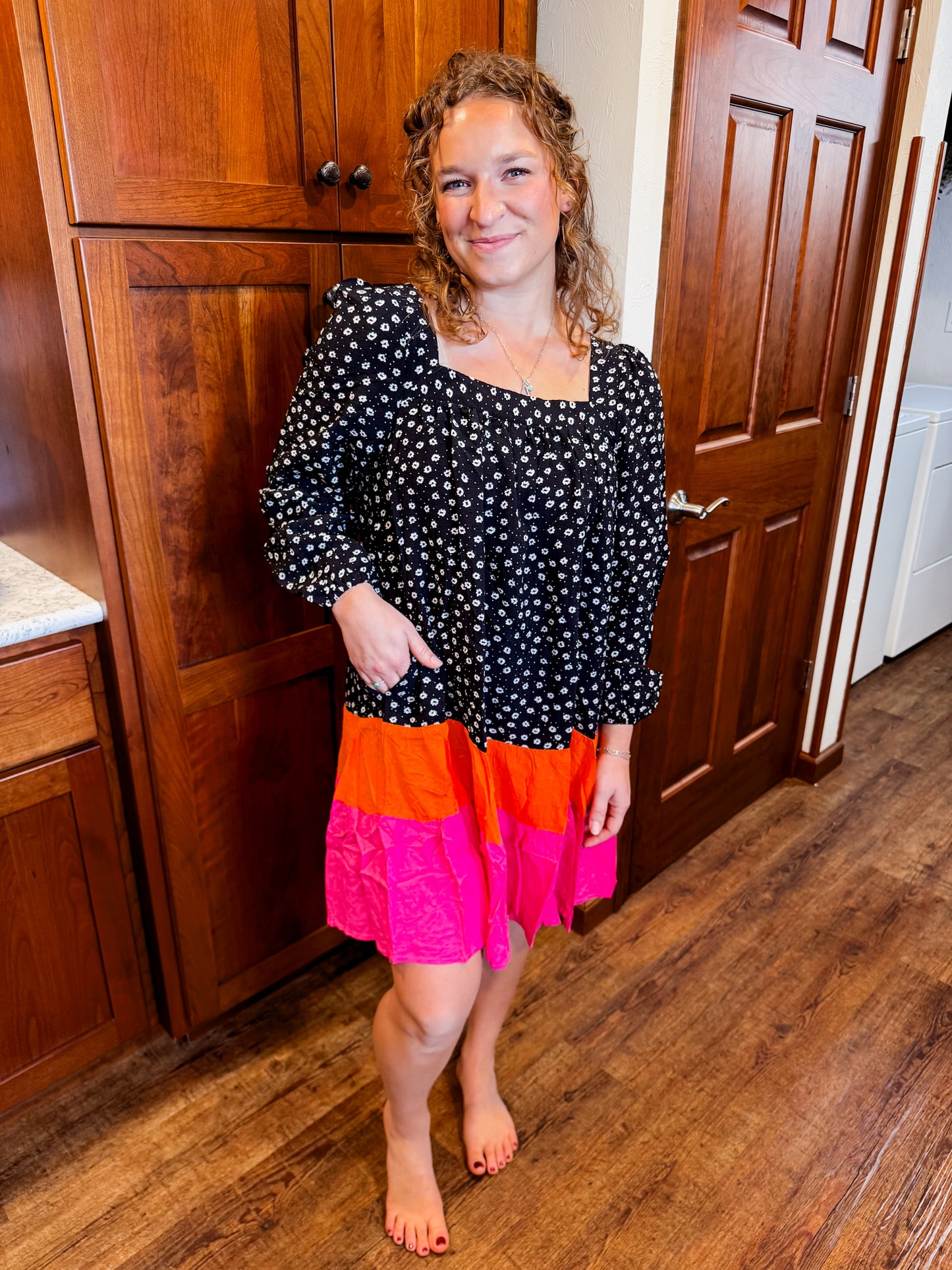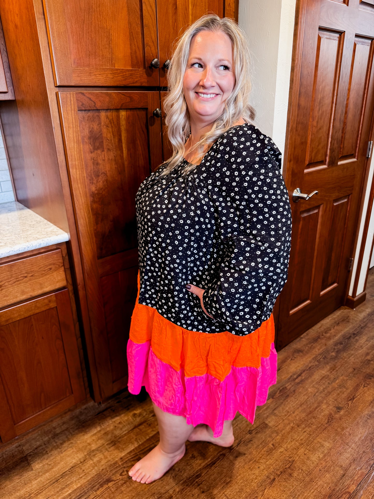Bring the fun and the femininity with this flirty color-block dress that was made for easy, feel-good style. The black-and-white ditsy print keeps things classic on top, while the bold orange and hot pink tiered skirt adds the perfect pop of playful color. Designed with a relaxed, flowy fit that moves beautifully and flatters every curve, this dress is your go-to for brunch dates, girls’ days, or any moment you want to feel effortlessly cute. Pair it with sandals or booties and you’re set!