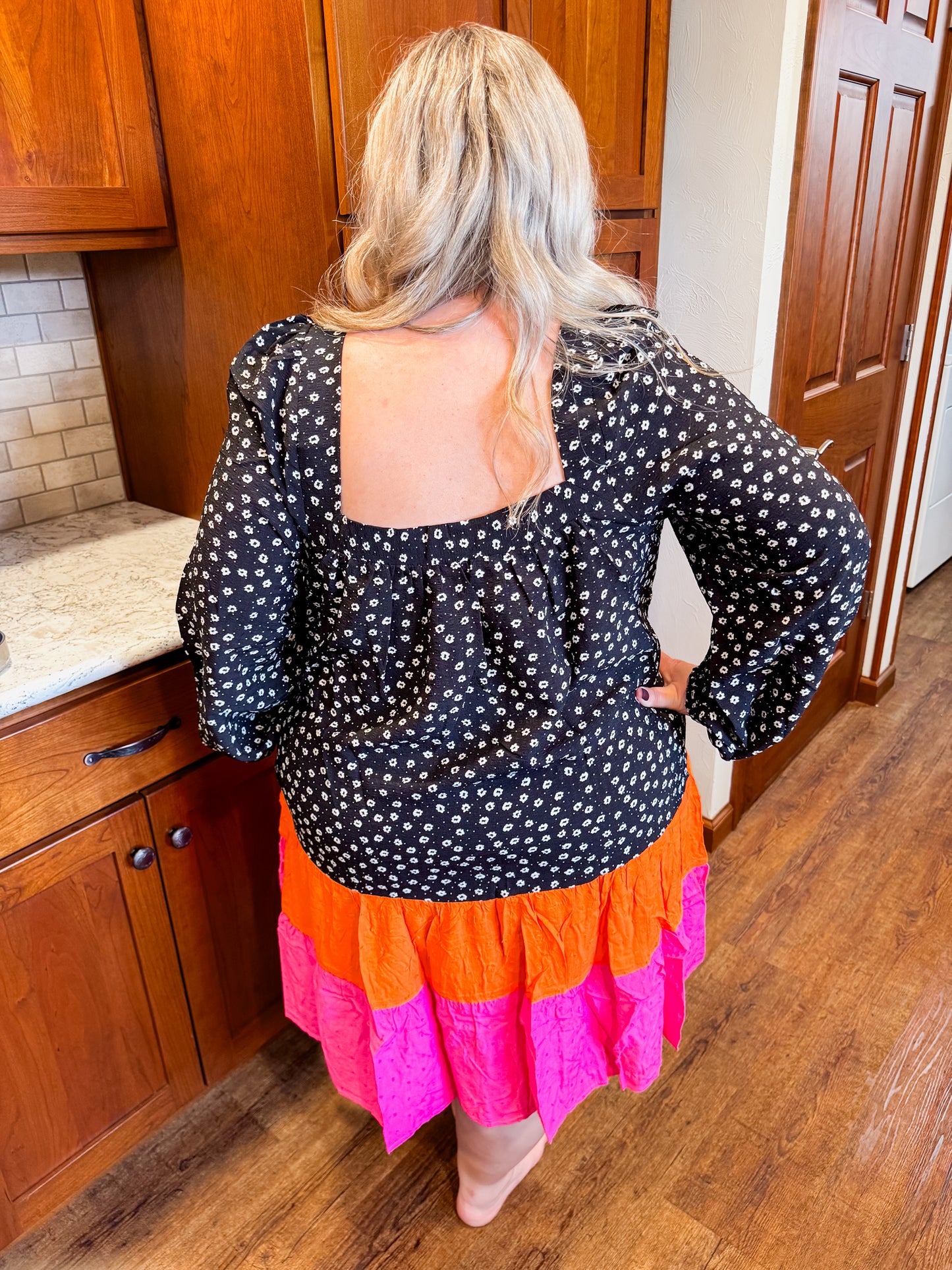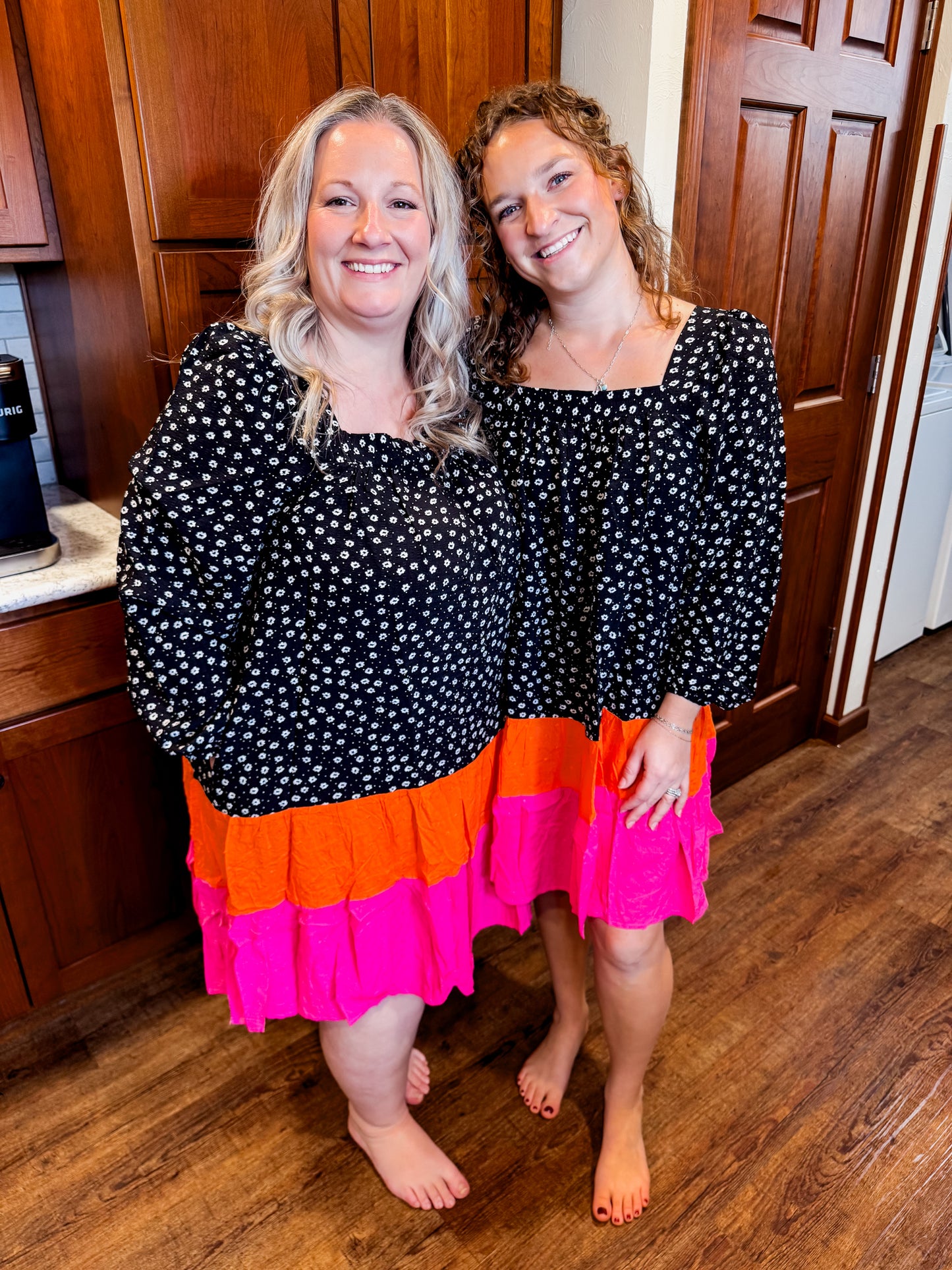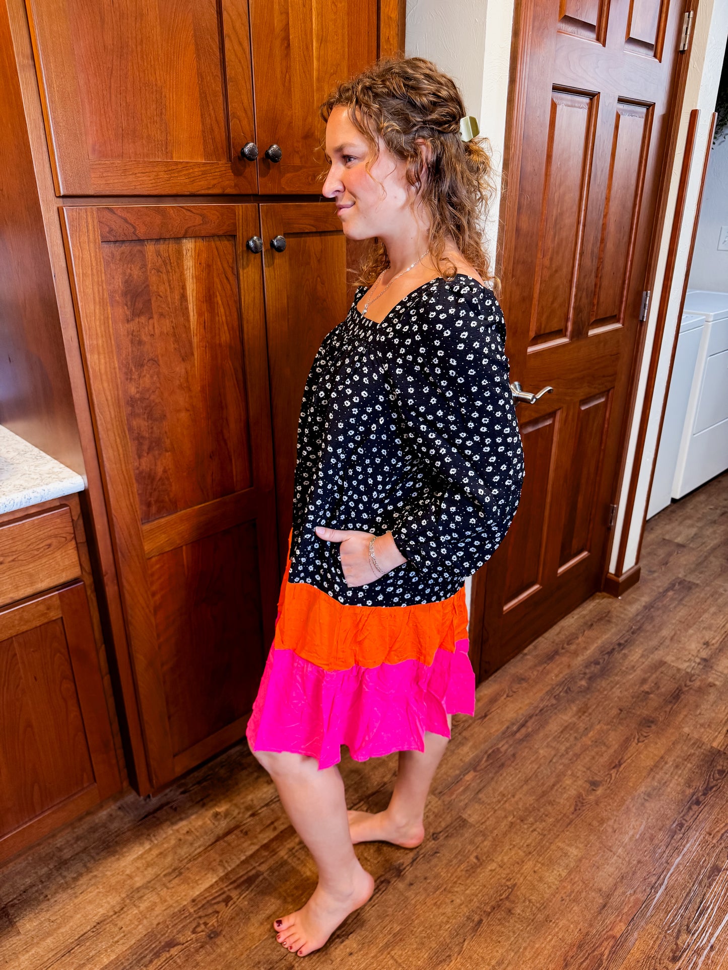 Bring the fun and the femininity with this flirty color-block dress that was made for easy, feel-good style. The black-and-white ditsy print keeps things classic on top, while the bold orange and hot pink tiered skirt adds the perfect pop of playful color. Designed with a relaxed, flowy fit that moves beautifully and flatters every curve, this dress is your go-to for brunch dates, girls’ days, or any moment you want to feel effortlessly cute. Pair it with sandals or booties and you’re set!