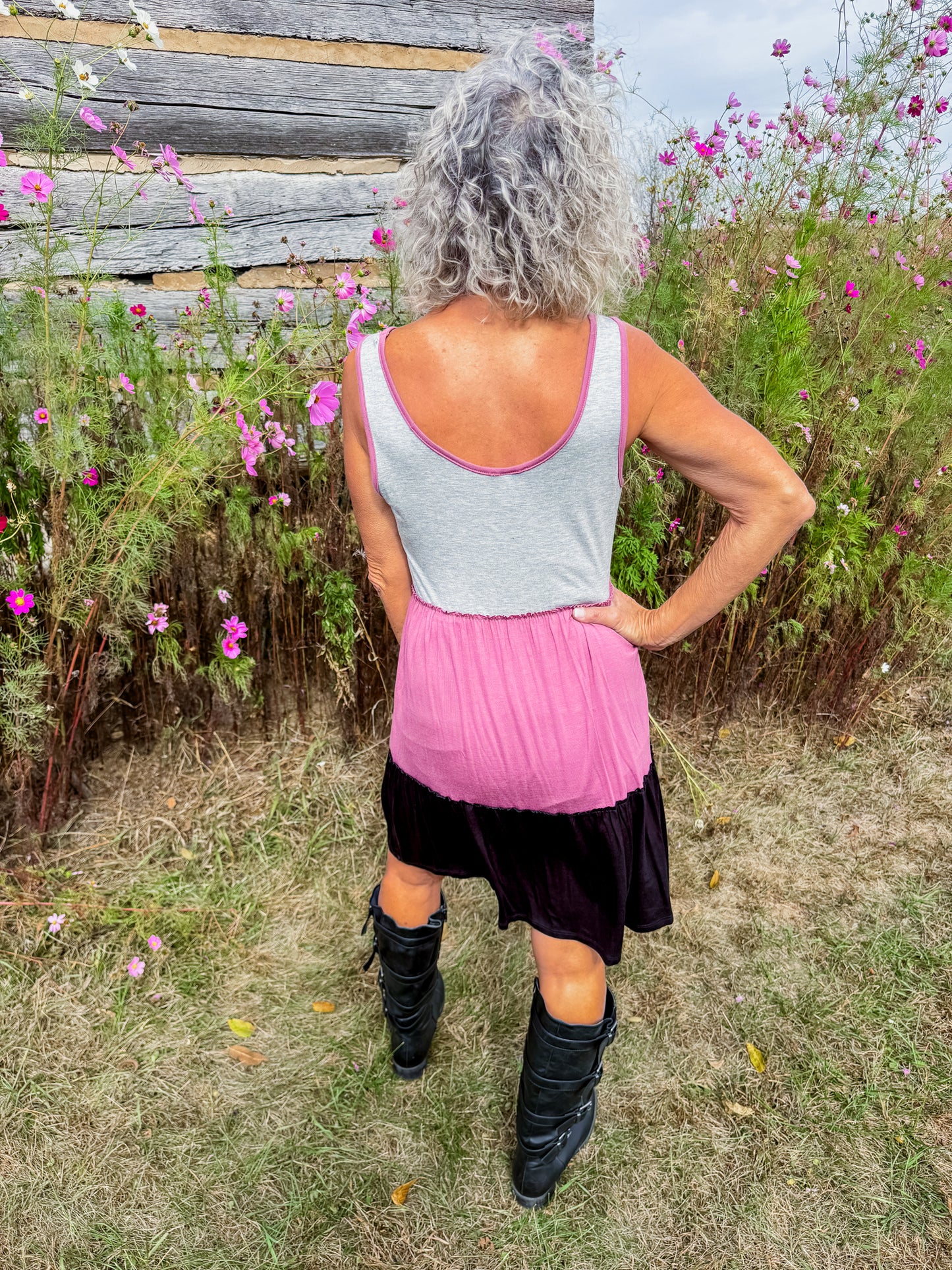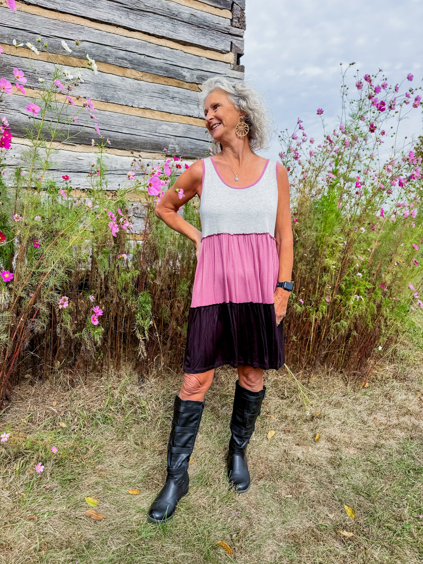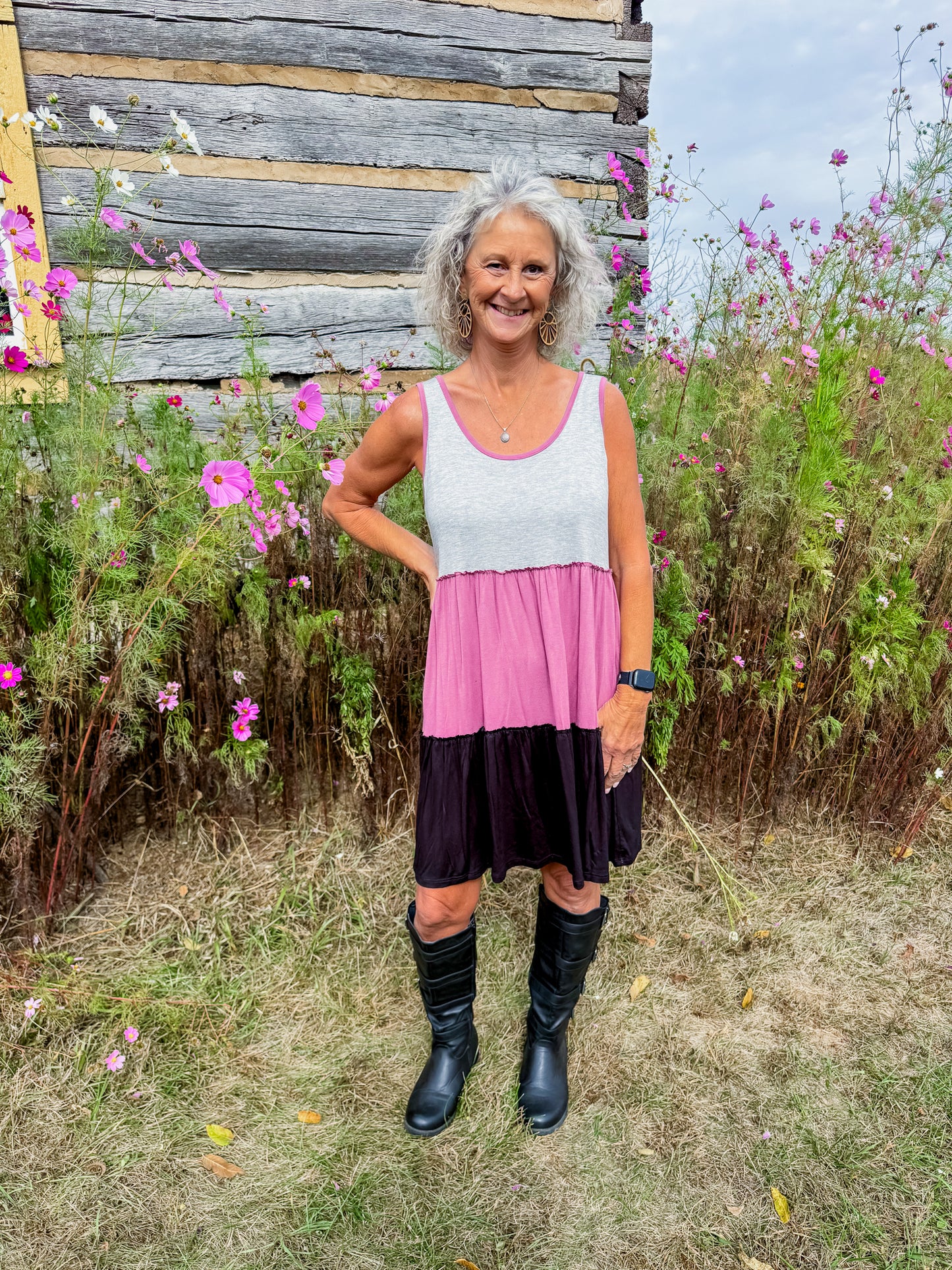 Soft, simple, and oh-so-flattering 💕 The Sweet Harmony Dress features a flowy tiered design with soft color blocking in grey, mauve, and black. Lightweight, breezy, and made with pockets — perfect for layering or wearing solo all season long!