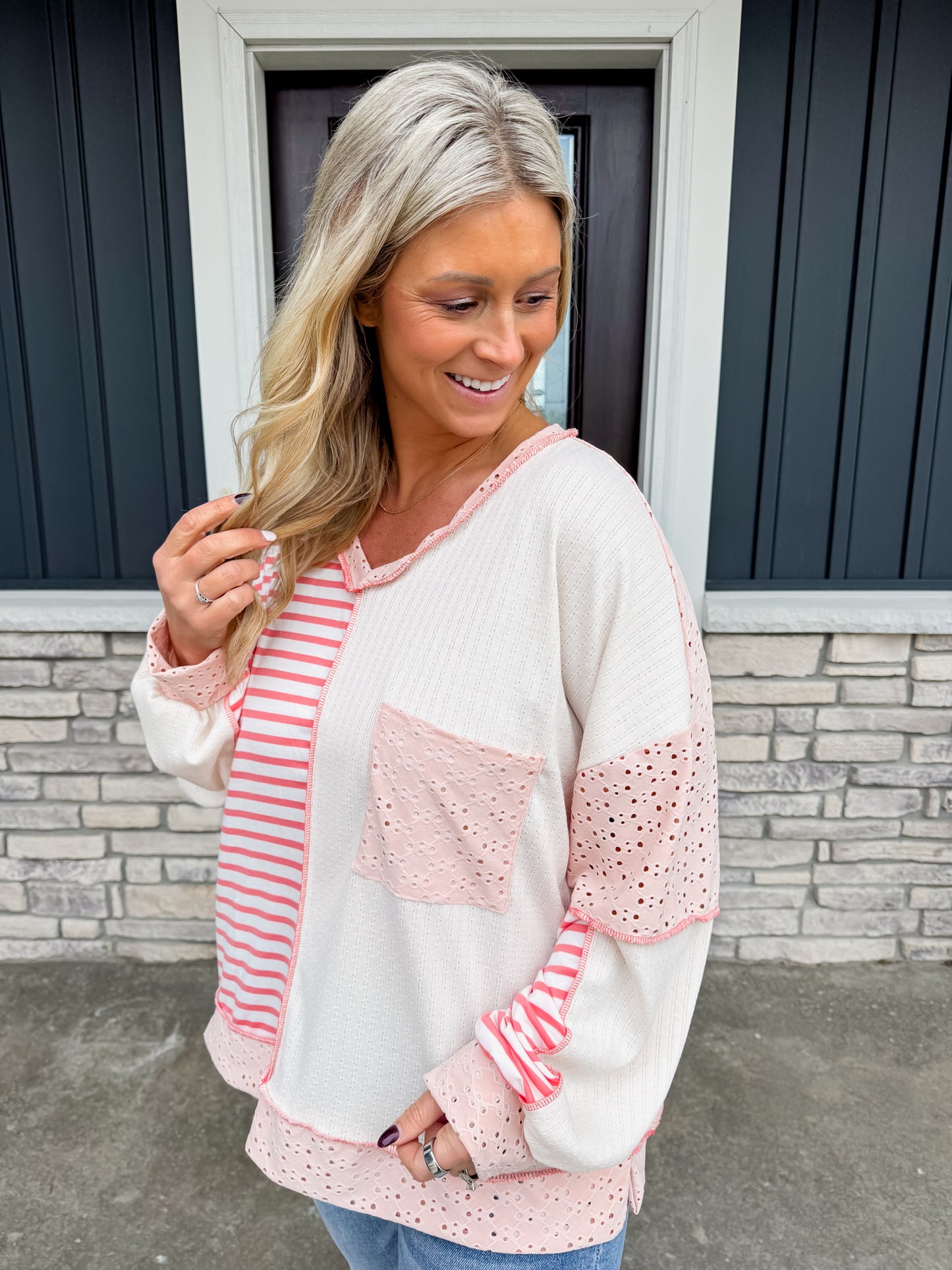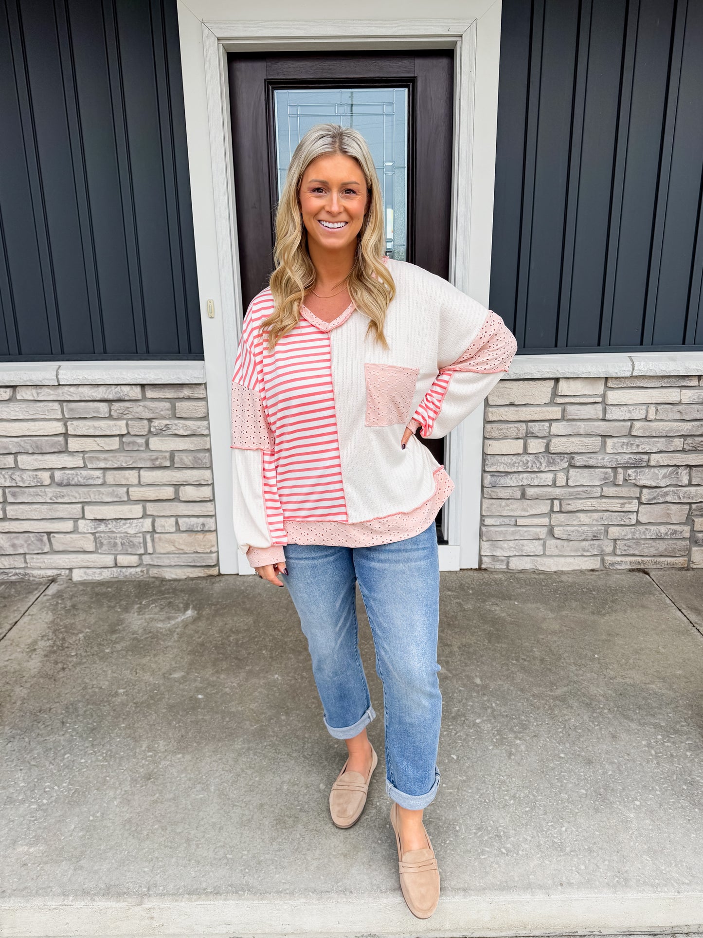 Soft, feminine, and full of charming detail—the Truly Yours Top is one of those pieces that feels special the moment you put it on. With its mix of stripes, textured fabric, and dainty contrast details, this top gives effortless boutique style while staying incredibly comfortable.