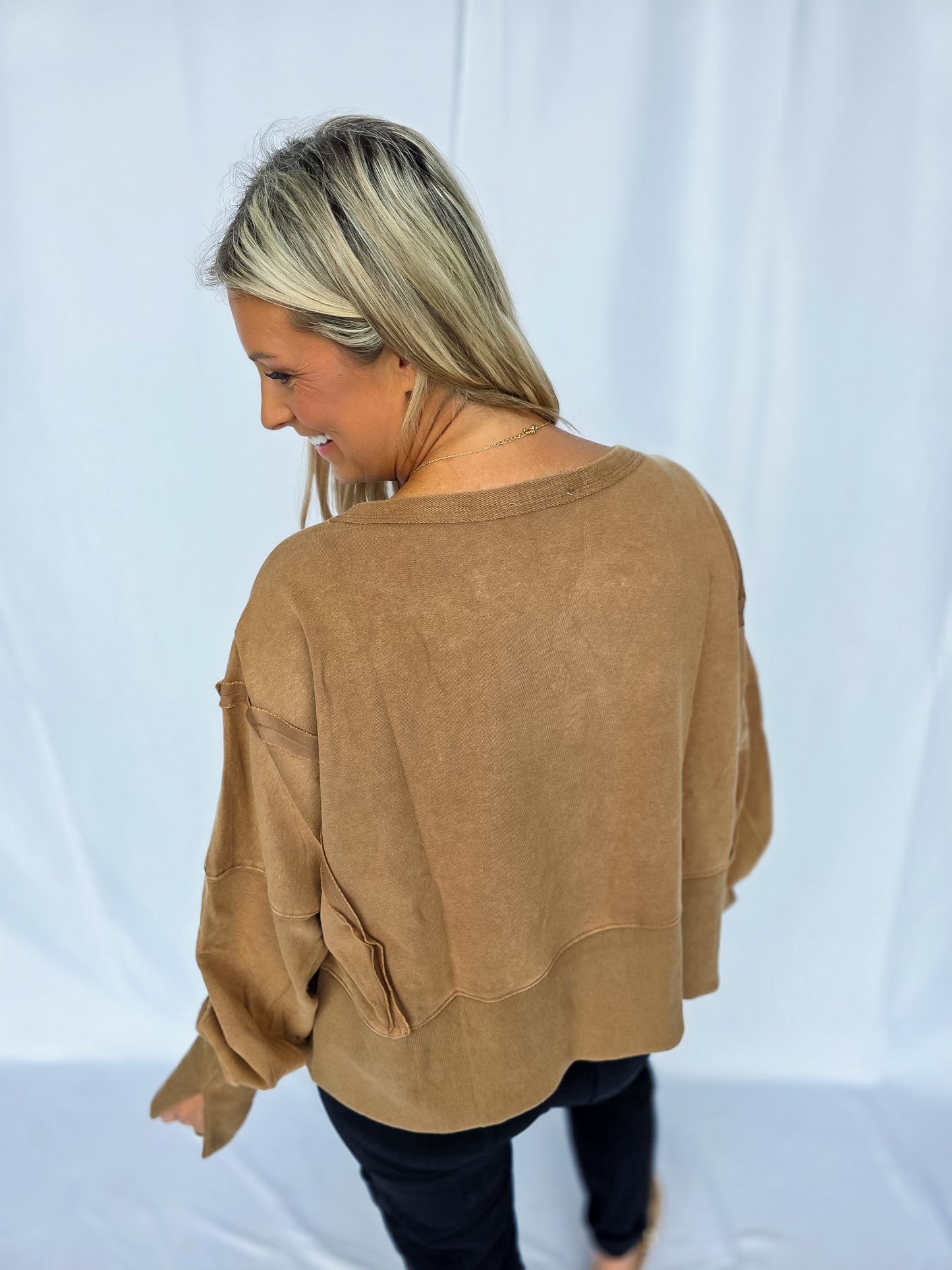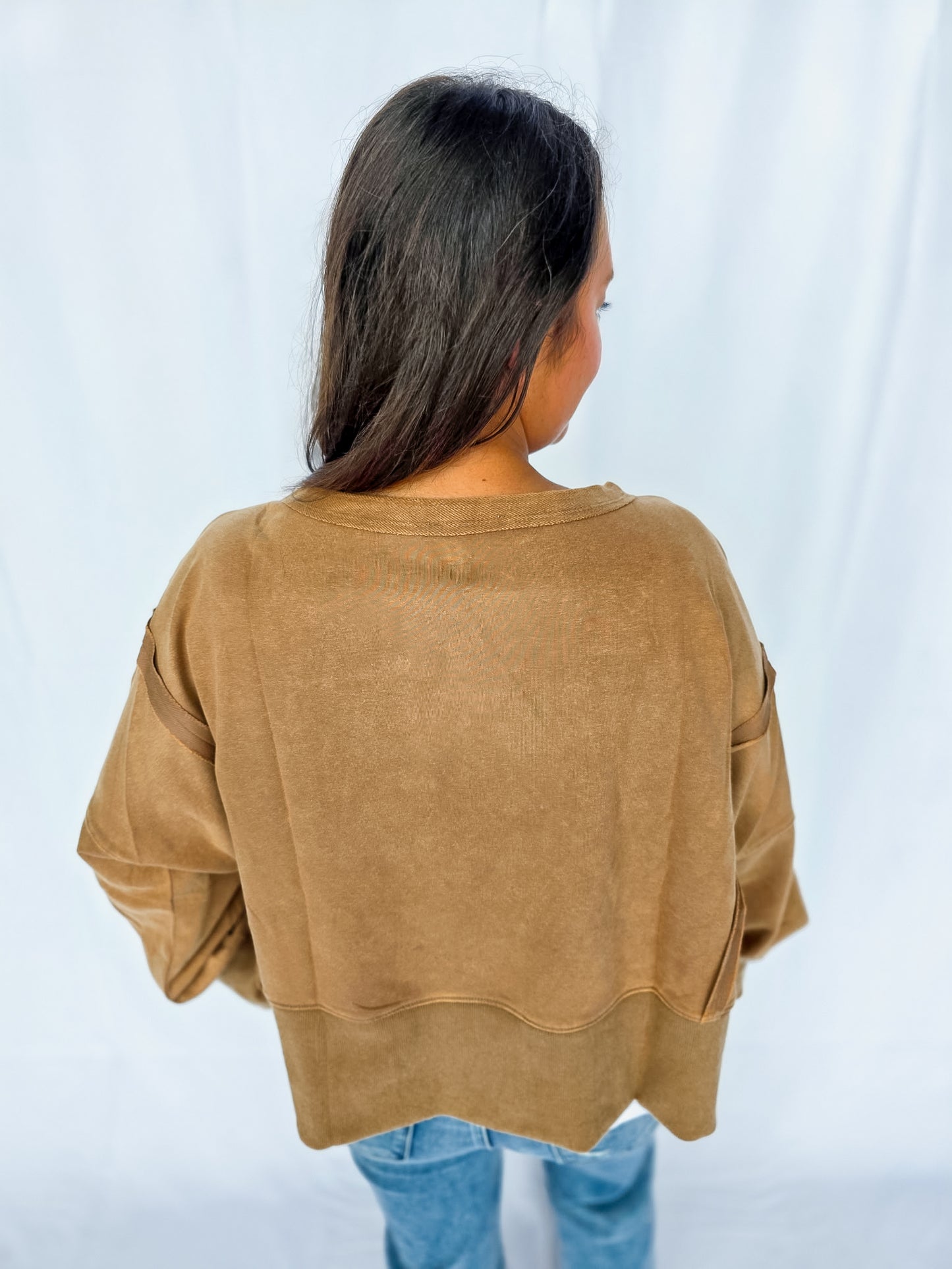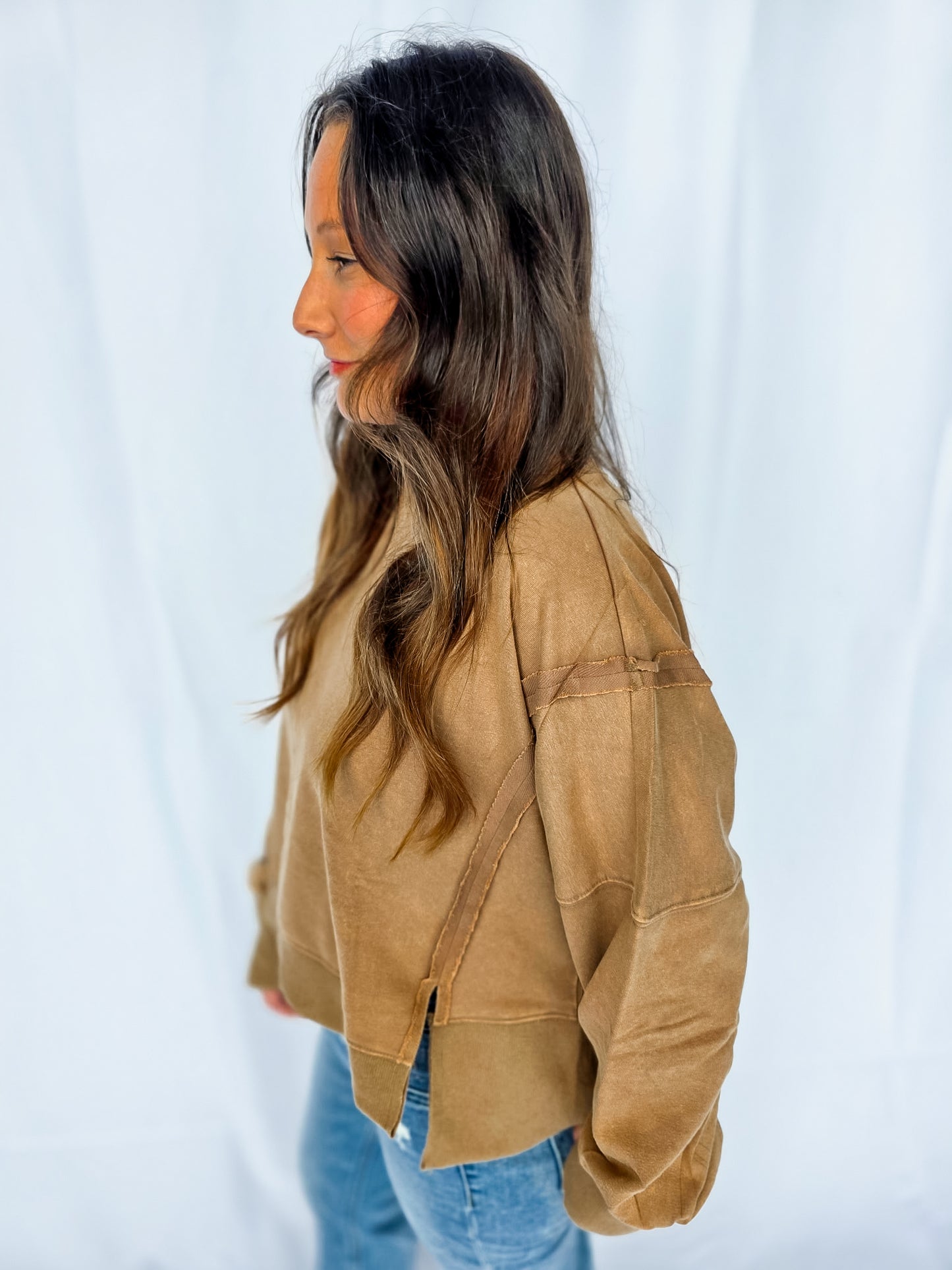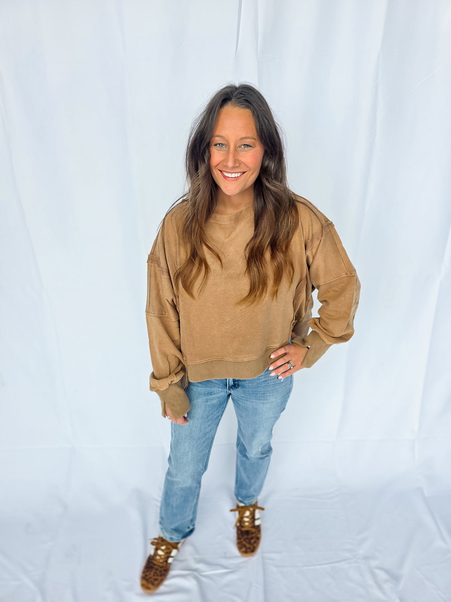 Meet your new go-to layer 🤎 The Mocha Lounge Pullover is easy, effortless, and oh-so comfy. With its relaxed fit and neutral tone, it’s the definition of throw-on-and-go style. Pair it with leggings for errands, denim for casual days, or layer it up for fall vibes. A true closet essential you’ll reach for again + again! It features a dropped shoulder and cropped fit! There are also raw-edge seam details!