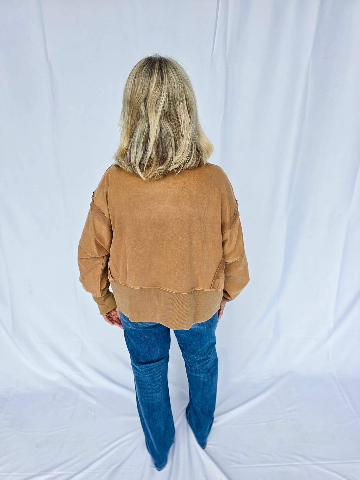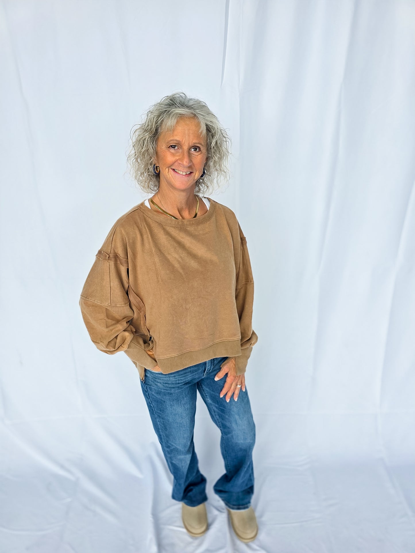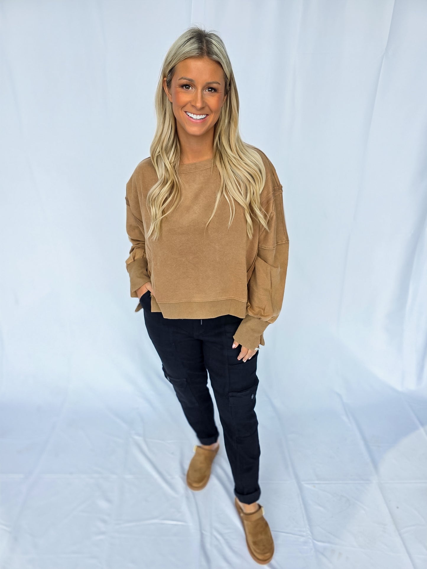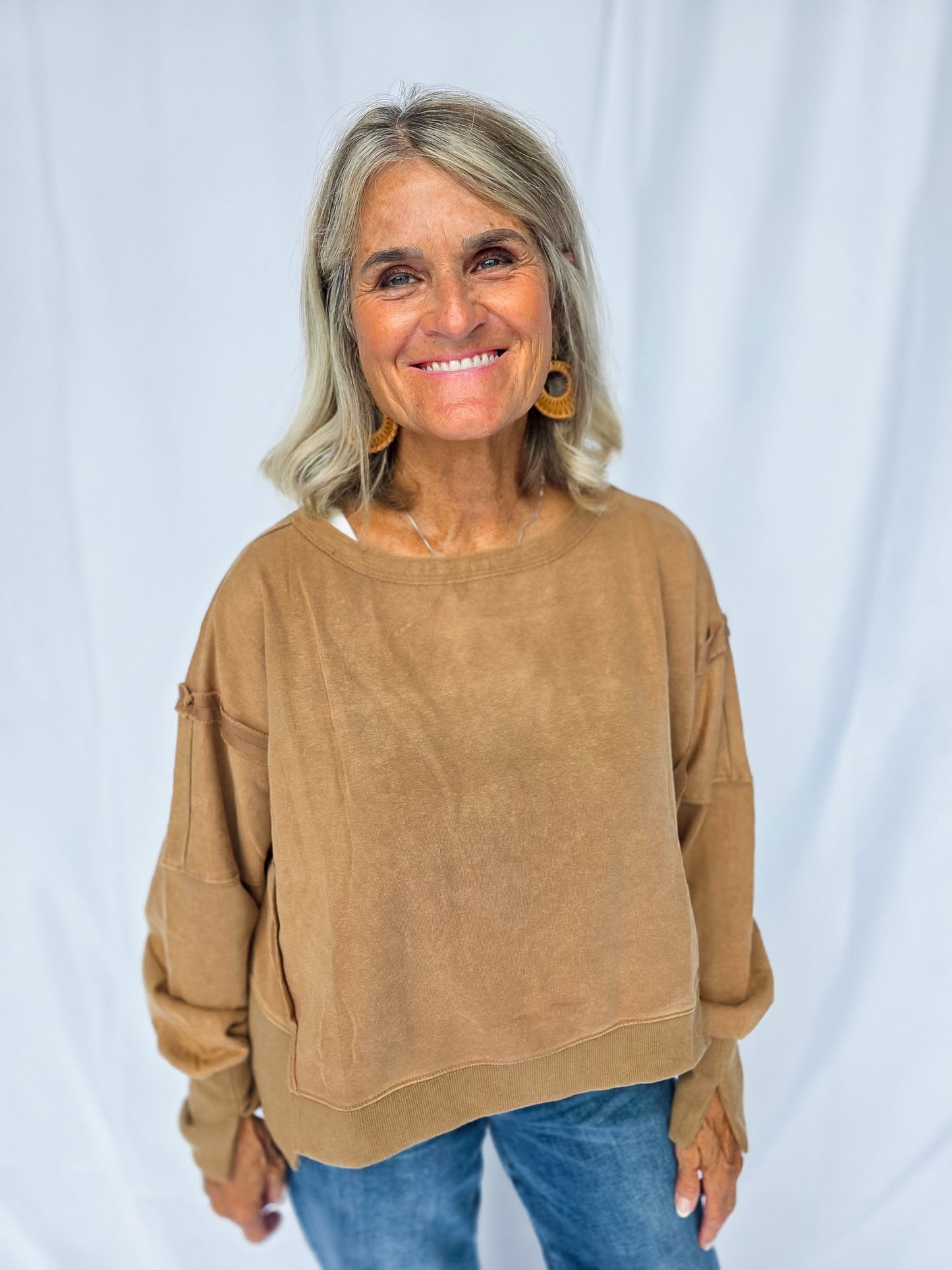 Meet your new go-to layer 🤎 The Mocha Lounge Pullover is easy, effortless, and oh-so comfy. With its relaxed fit and neutral tone, it’s the definition of throw-on-and-go style. Pair it with leggings for errands, denim for casual days, or layer it up for fall vibes. A true closet essential you’ll reach for again + again! It features a dropped shoulder and cropped fit! There are also raw-edge seam details!