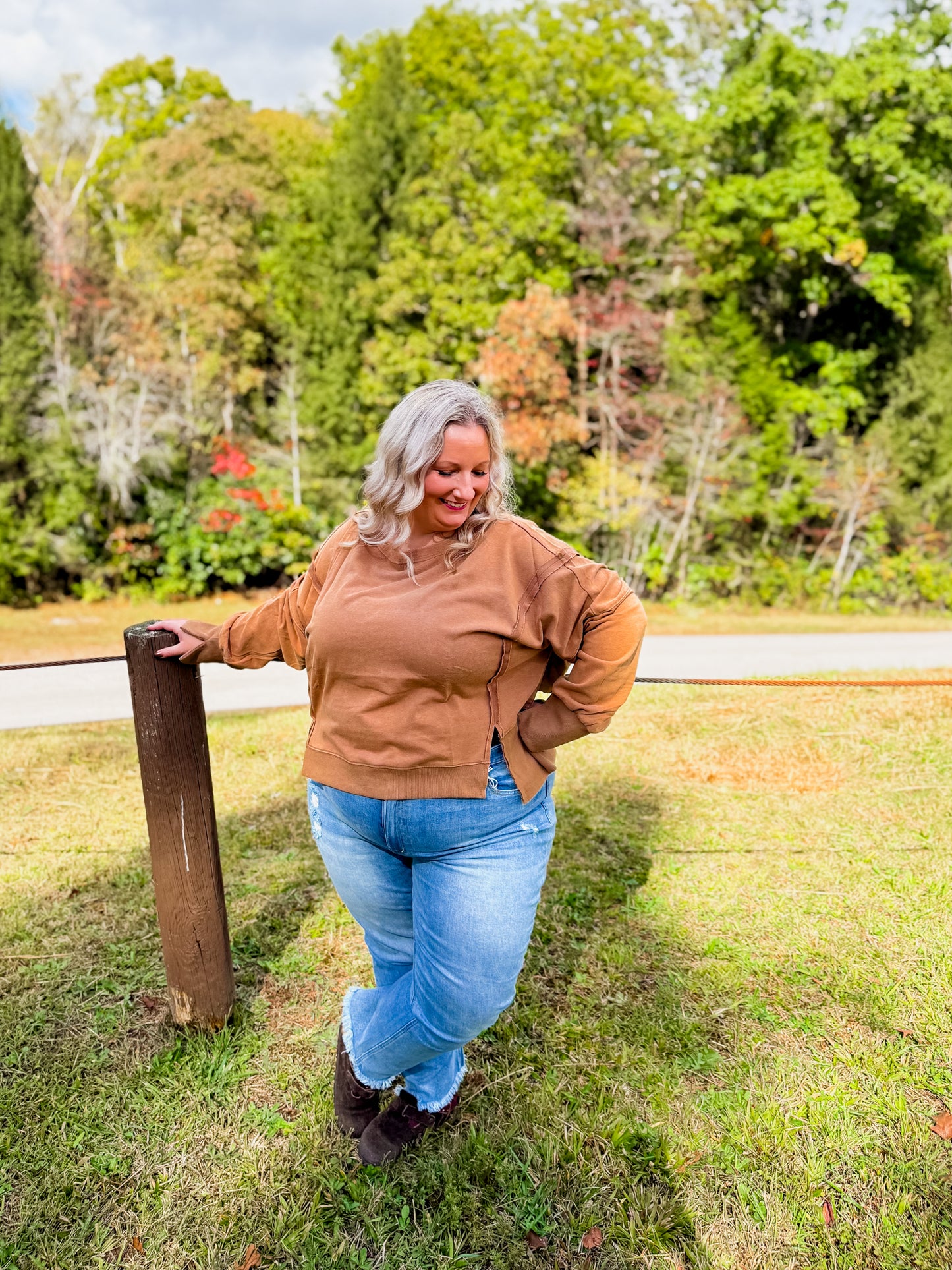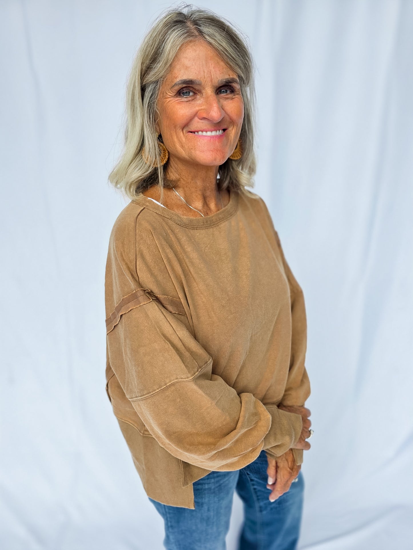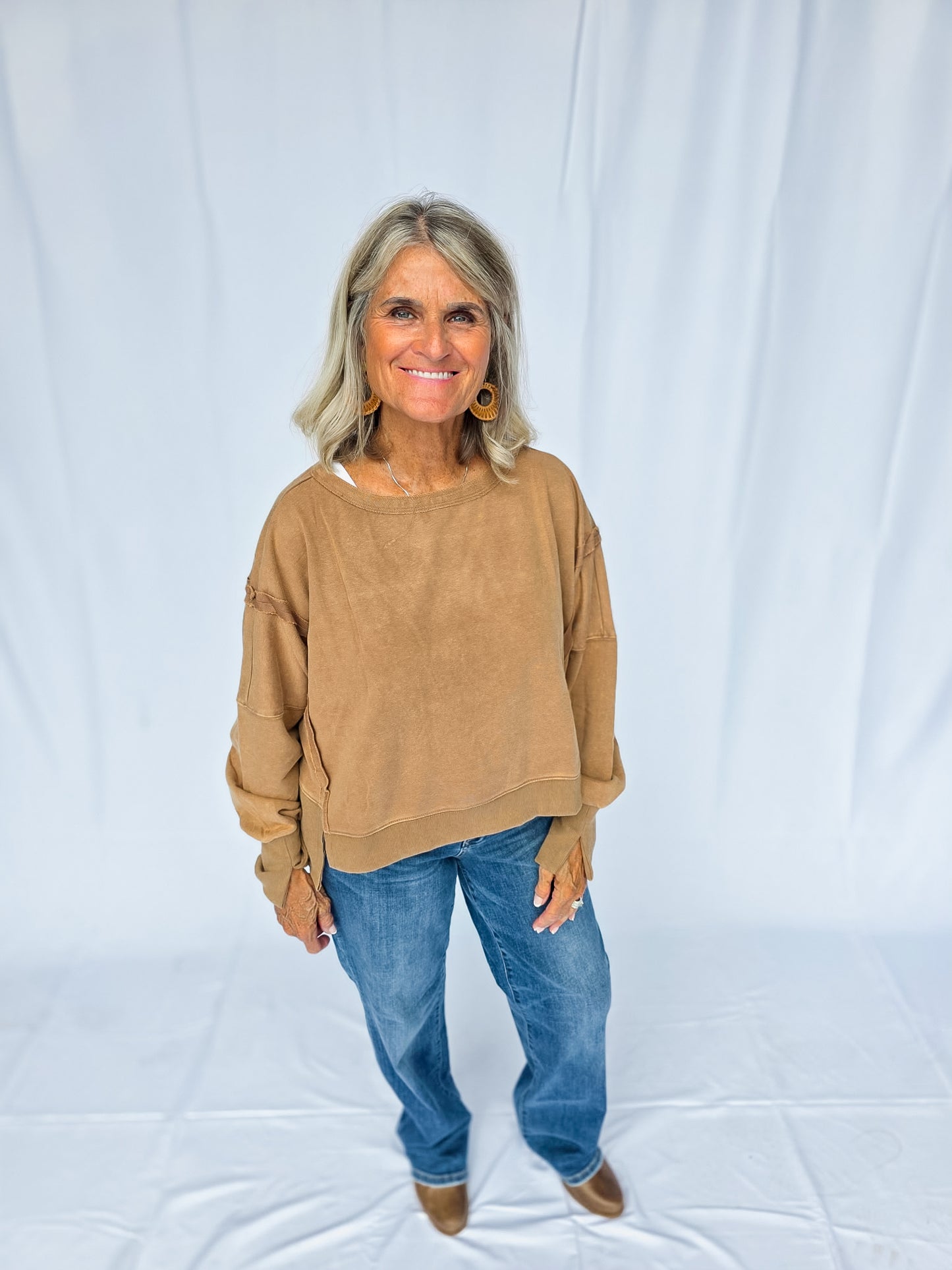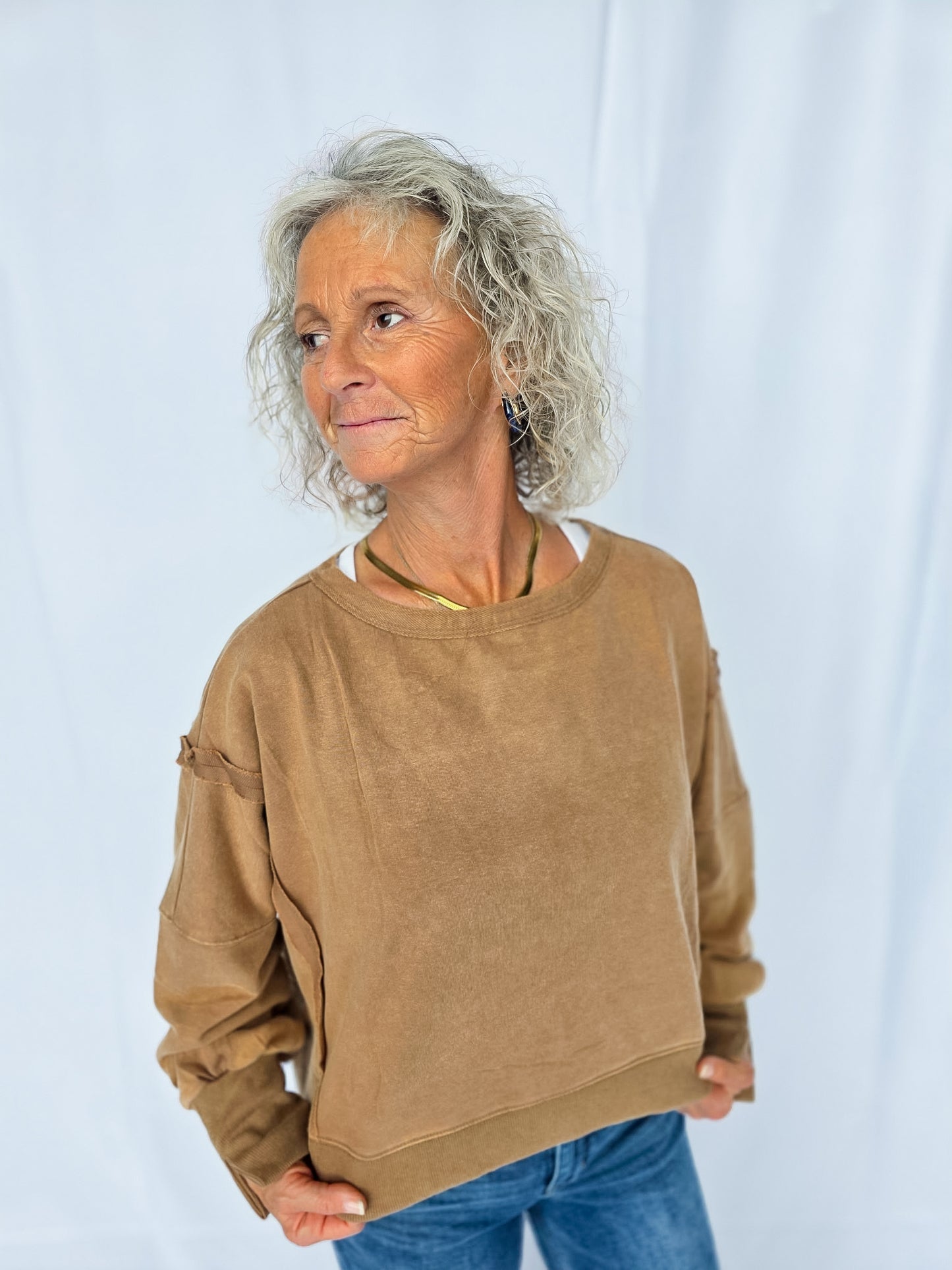 Meet your new go-to layer 🤎 The Mocha Lounge Pullover is easy, effortless, and oh-so comfy. With its relaxed fit and neutral tone, it’s the definition of throw-on-and-go style. Pair it with leggings for errands, denim for casual days, or layer it up for fall vibes. A true closet essential you’ll reach for again + again! It features a dropped shoulder and cropped fit! There are also raw-edge seam details!