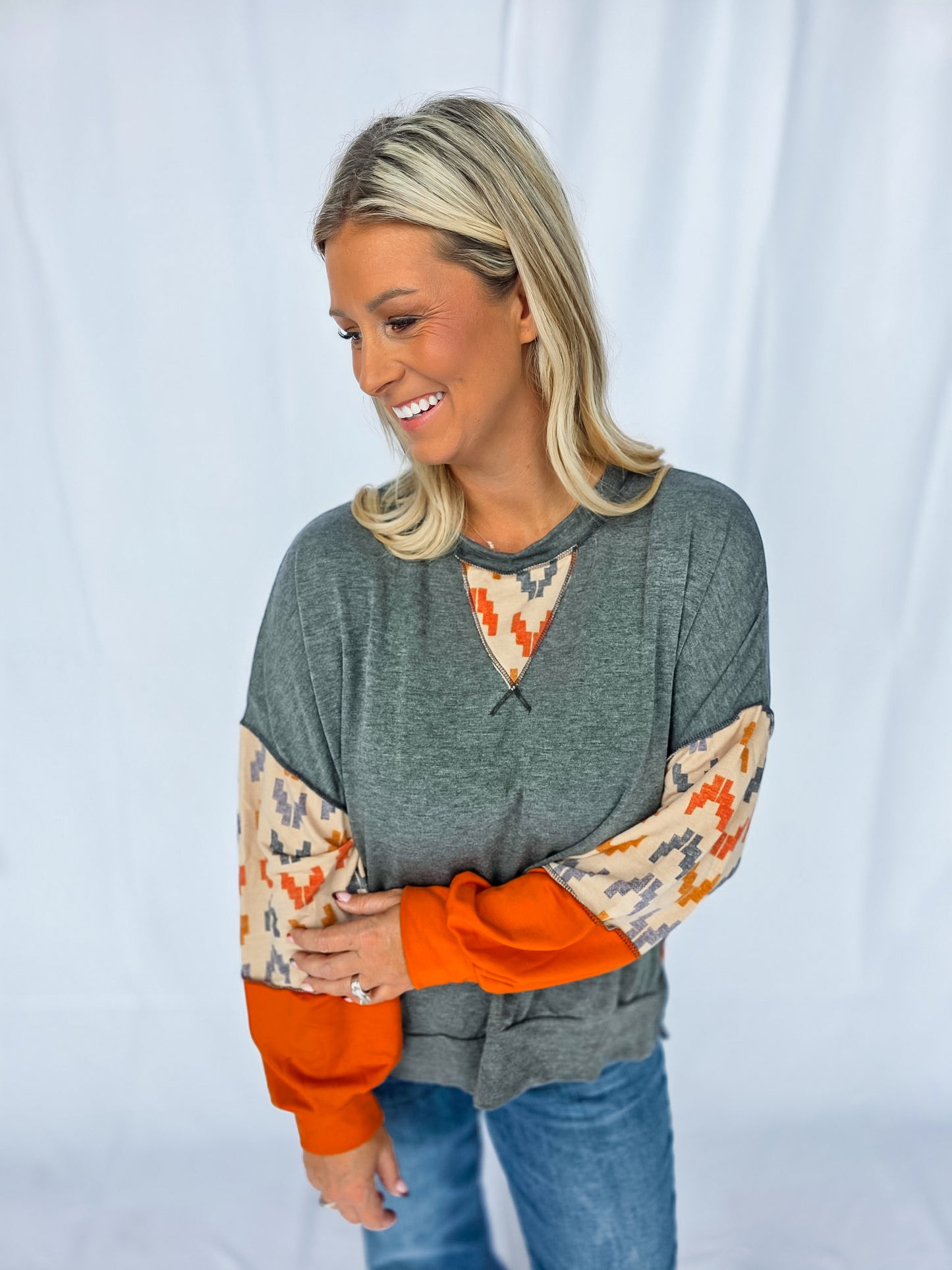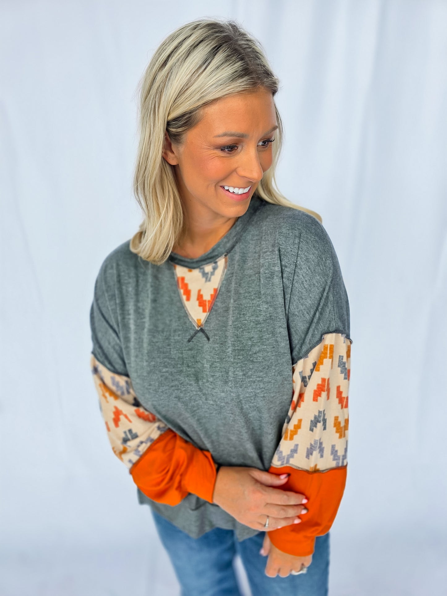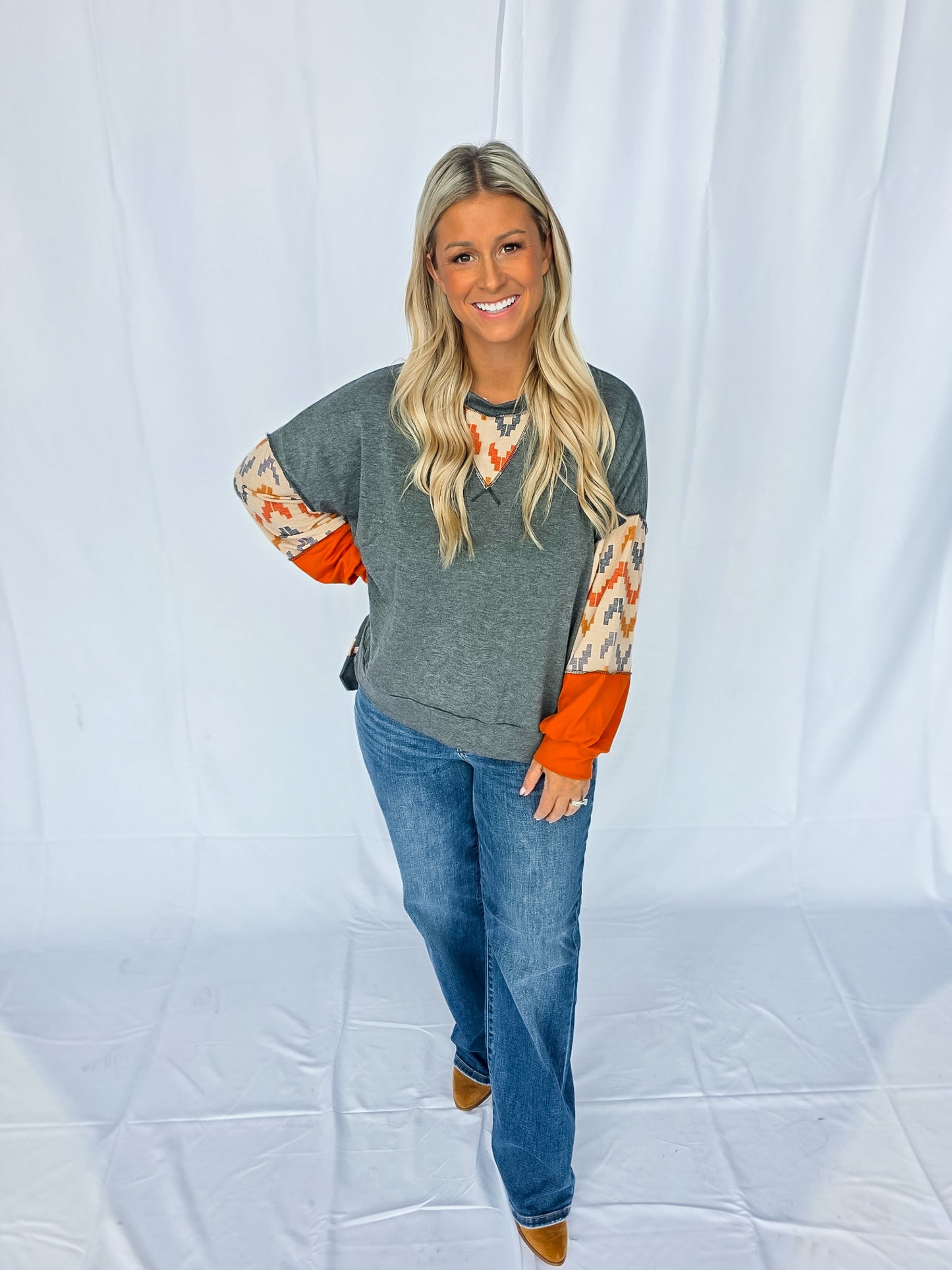 Cozy meets colorful in the Autumn Charm Pullover. đ With its soft charcoal body and statement sleeves featuring playful prints + warm rust tones, this top is the perfect blend of casual comfort and fall style. Pair it with denim and sneakers for an easy everyday look youâll love to repeat. â¨