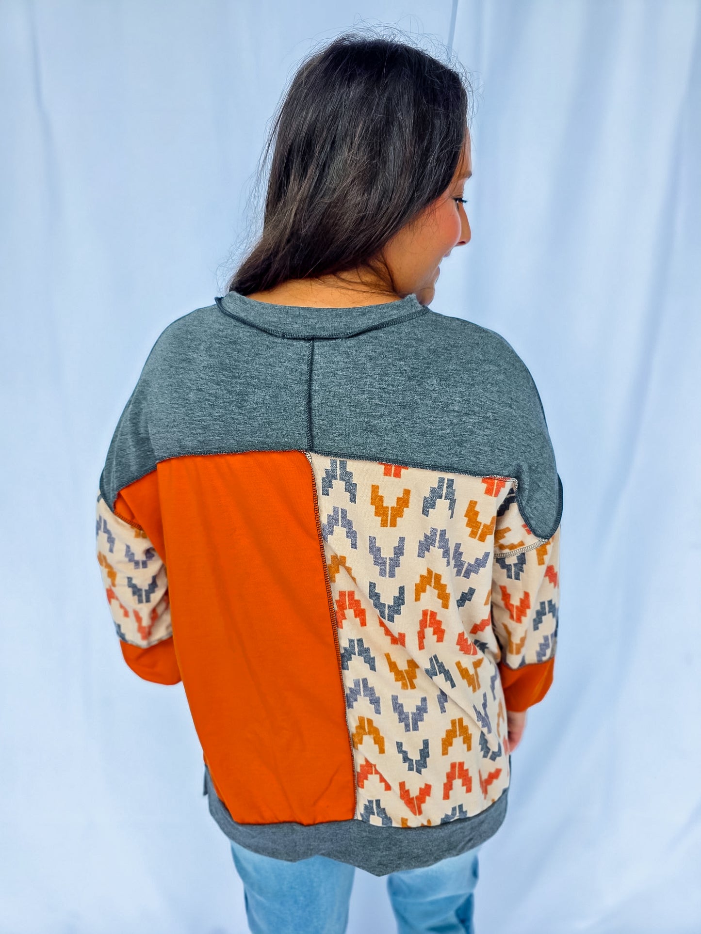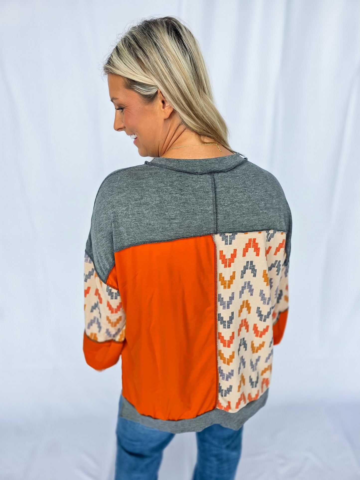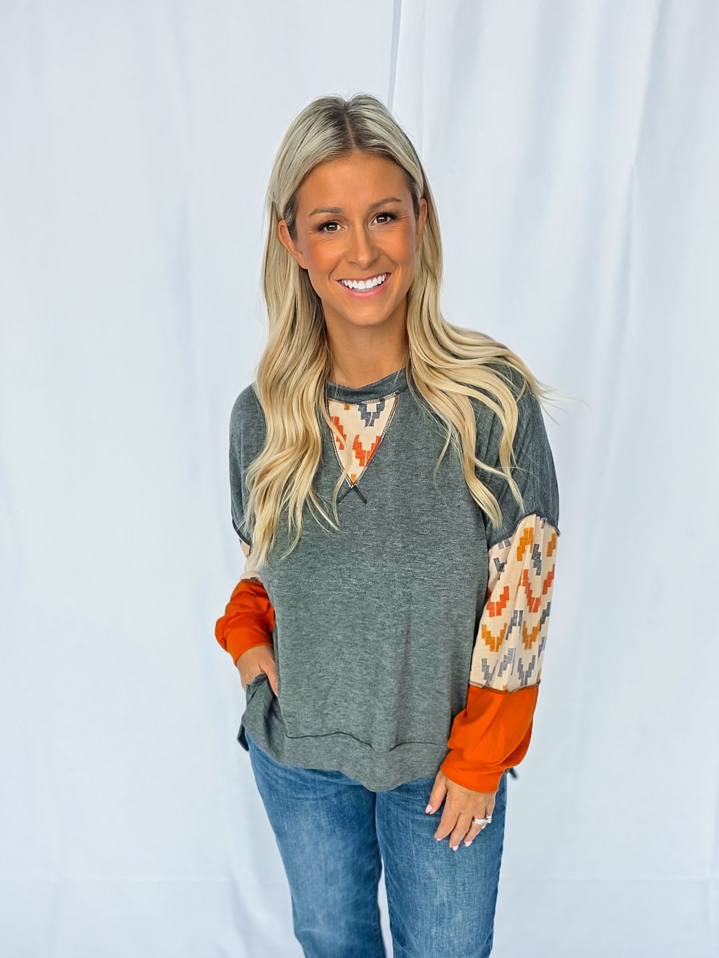 Cozy meets colorful in the Autumn Charm Pullover. đ With its soft charcoal body and statement sleeves featuring playful prints + warm rust tones, this top is the perfect blend of casual comfort and fall style. Pair it with denim and sneakers for an easy everyday look youâll love to repeat. â¨