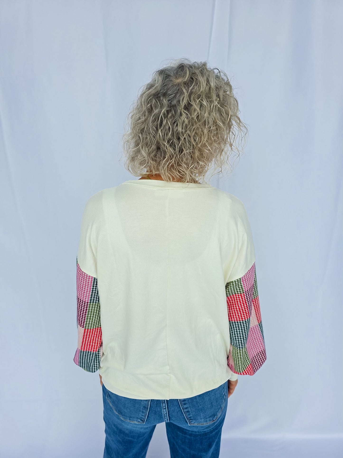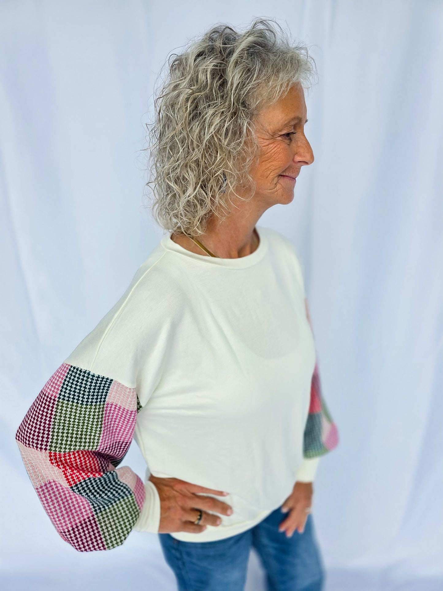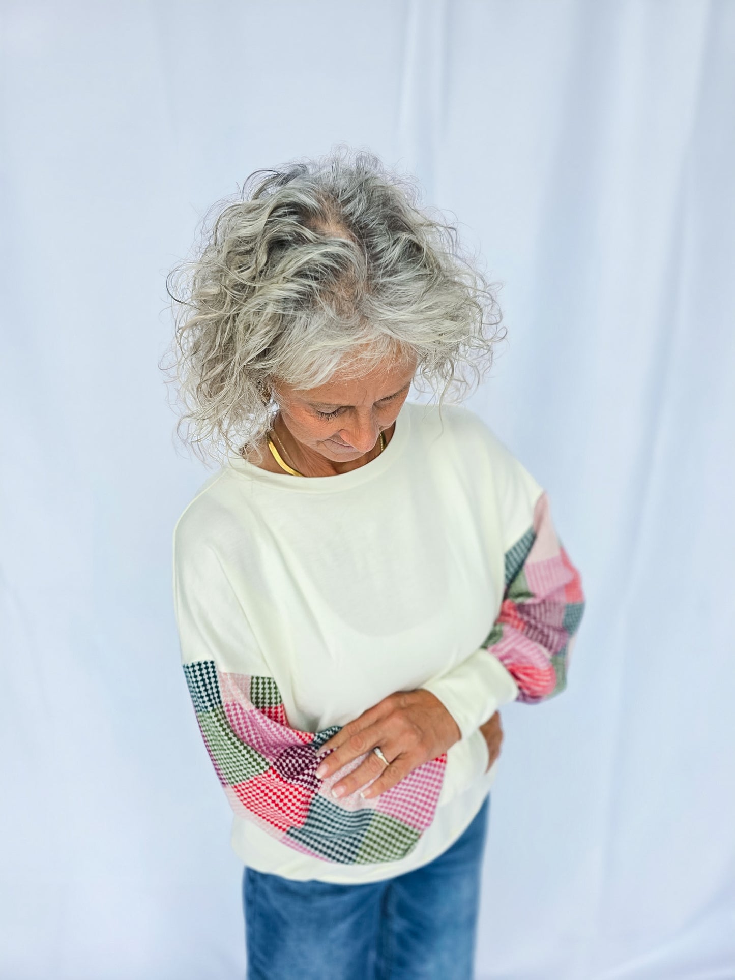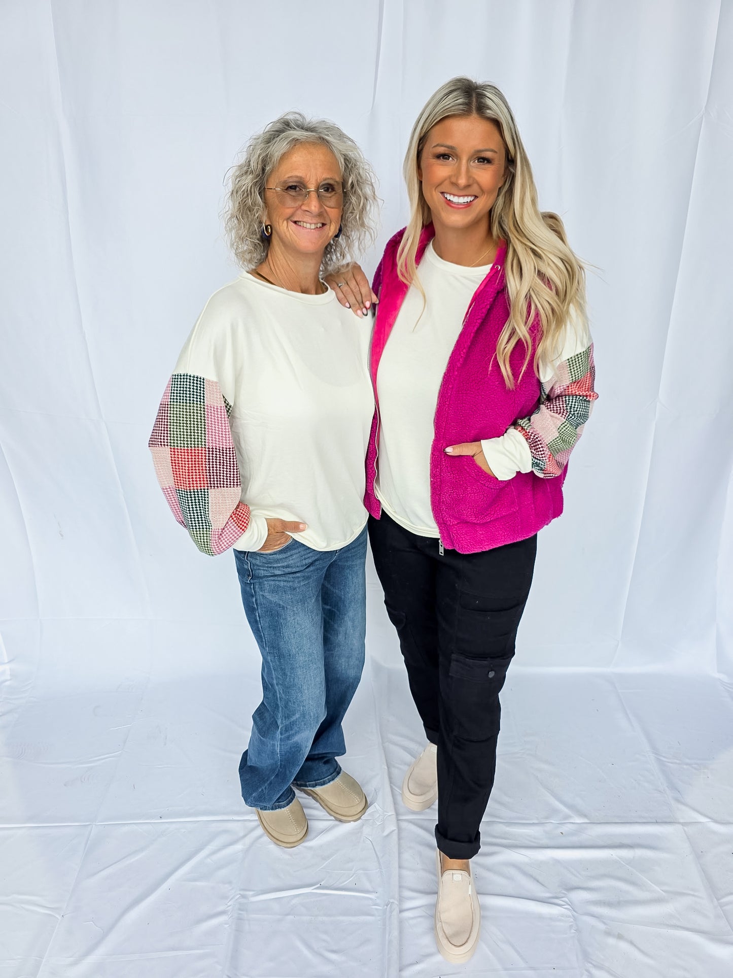 Cozy with a pop of playful color—the Blush Block Sweater is your new everyday favorite. 🤍 Featuring soft ivory with pink, green + plum patchwork sleeves, this relaxed fit is perfect for jeans, leggings, or layering on a chilly day. Comfy never looked so cute! ✨