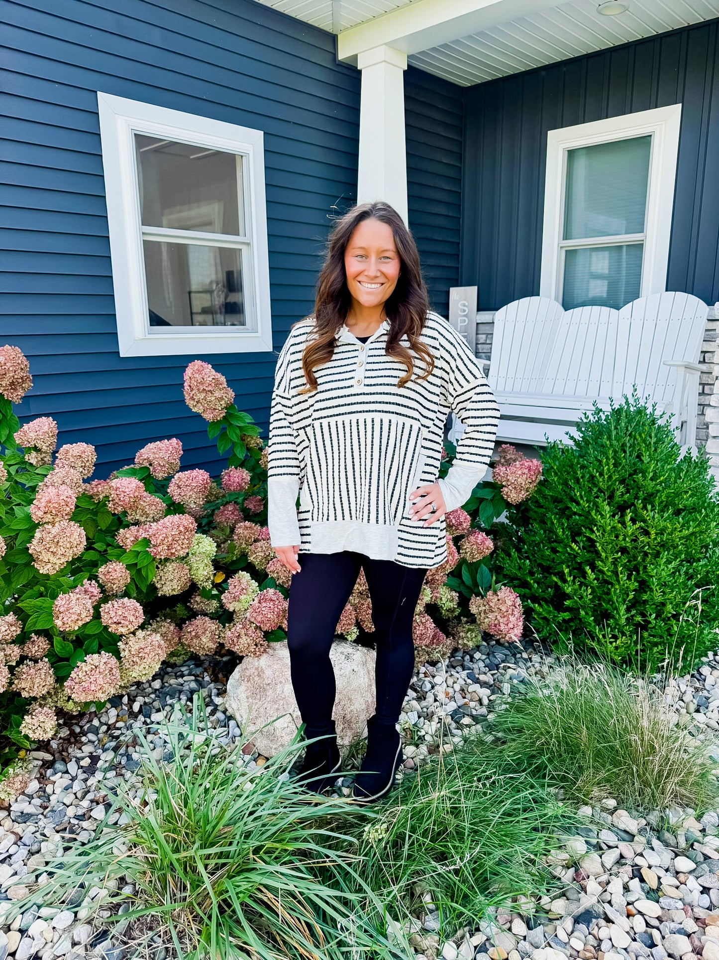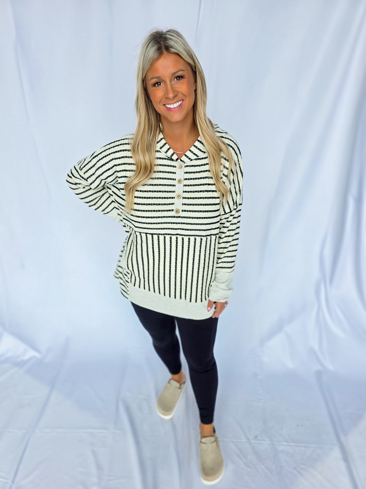 Bring effortless charm to your everyday look with The City Stroll Henley! Featuring bold black stripes on a soft ivory base, this relaxed-fit pullover is designed with a classic henley button neckline, cozy contrast trim, and a front kangaroo pocket for that perfect blend of style and function! The lightweight knit and easy silhouette make it an ideal throw-on-and-go piece—whether you’re running errands, grabbing coffee, or enjoying a casual weekend out!