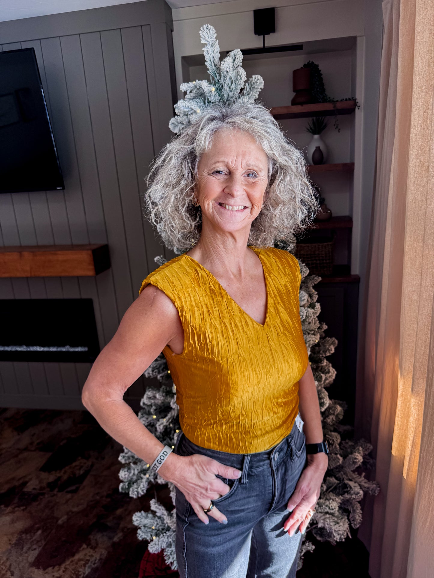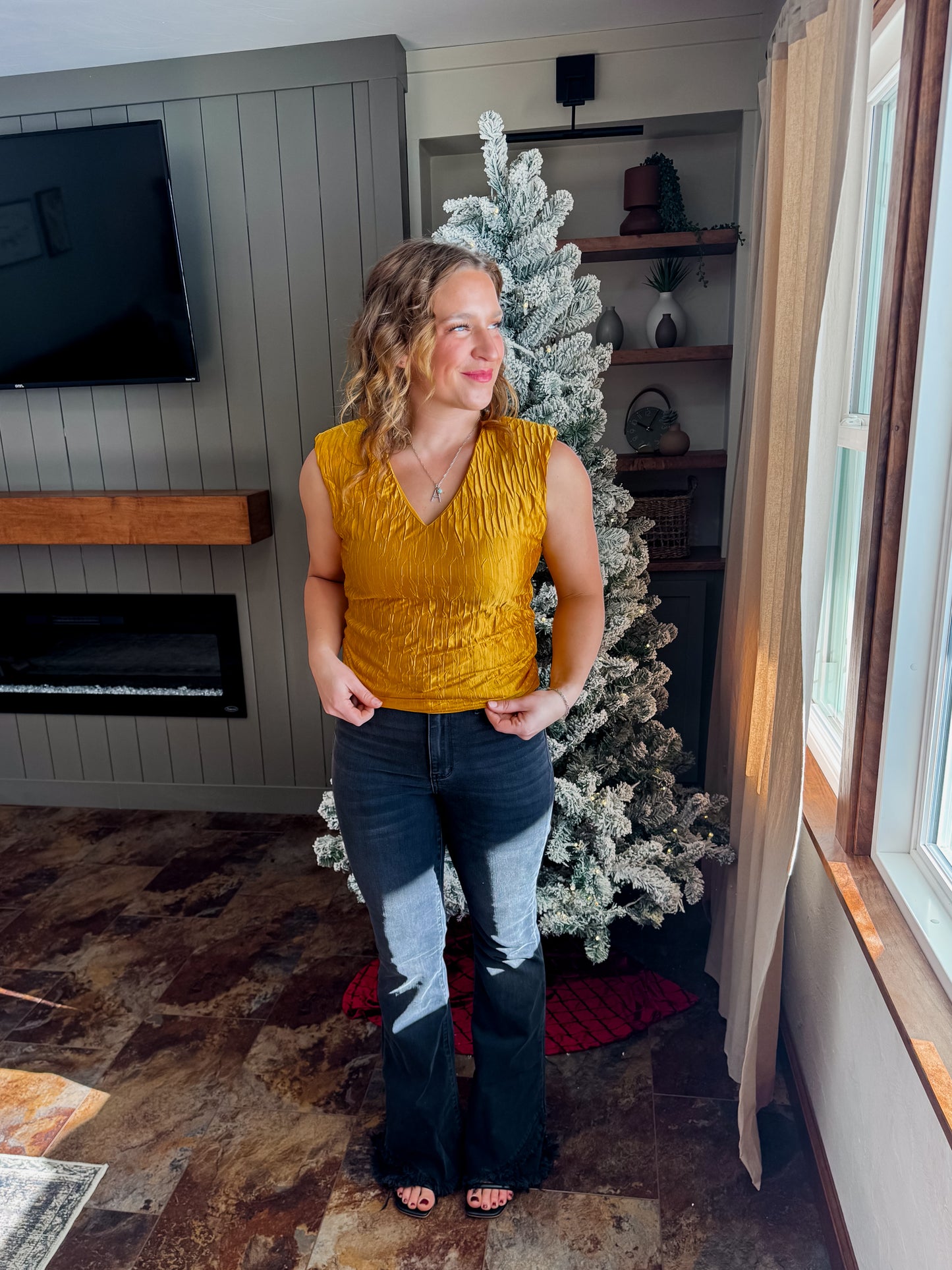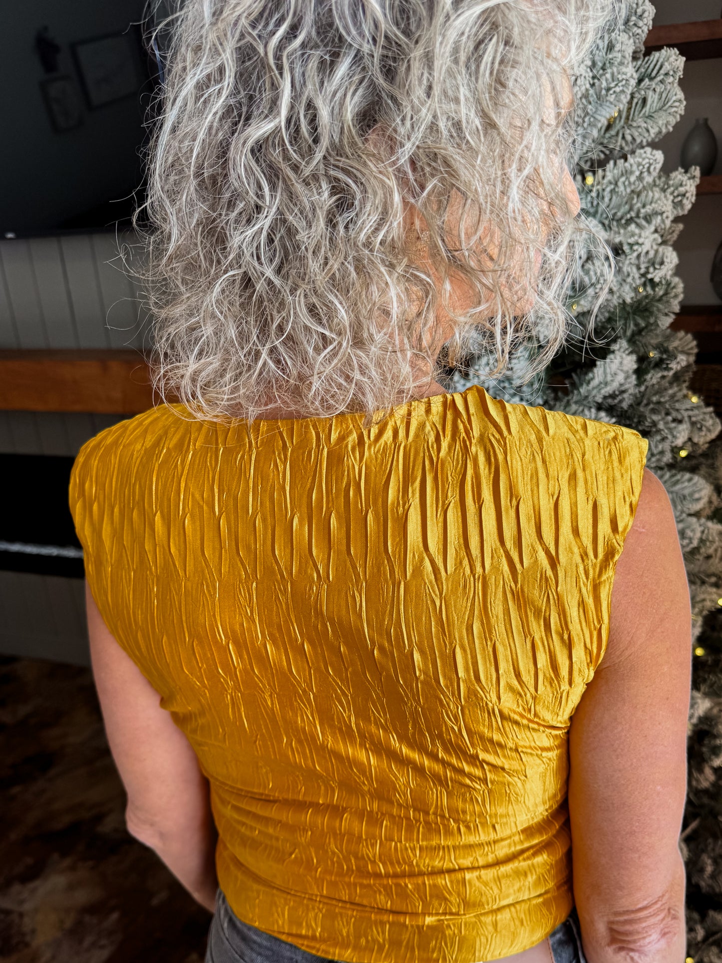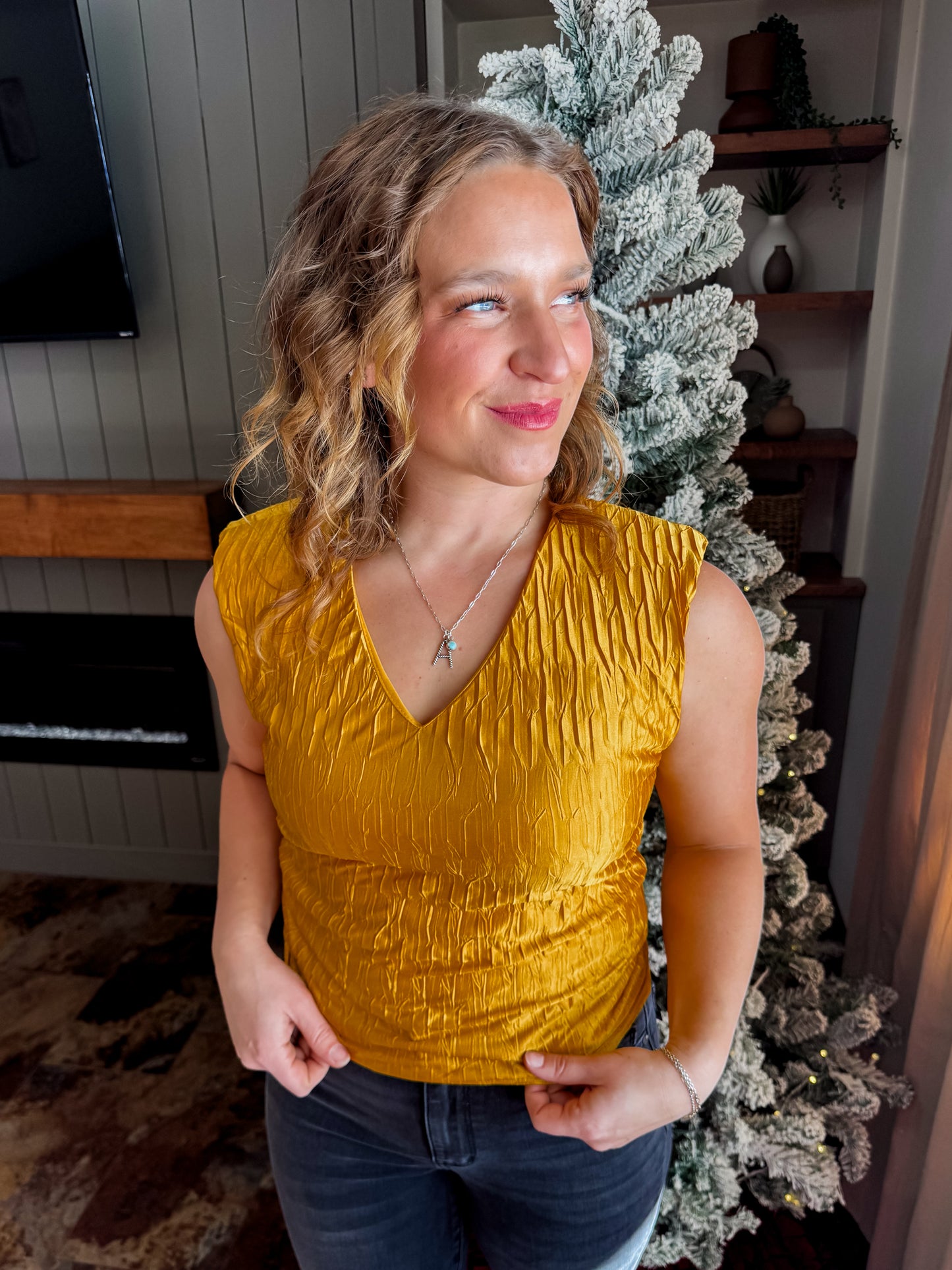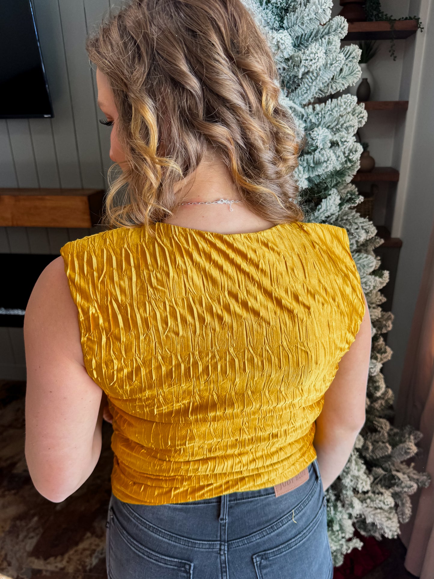 Say hello to your new statement piece. The Golden Eve Top brings instant glow with its rich, golden sheen and textured finish that elevates even the simplest outfit. Lightweight, eye-catching, and effortlessly stylish — this top is perfect for holiday dinners, nights out, or anytime you want your look to feel a little extra. Pair it with denim for a chic casual vibe or dress it up with a sleek skirt or trousers. It’s the kind of top that makes you stand out without even trying.