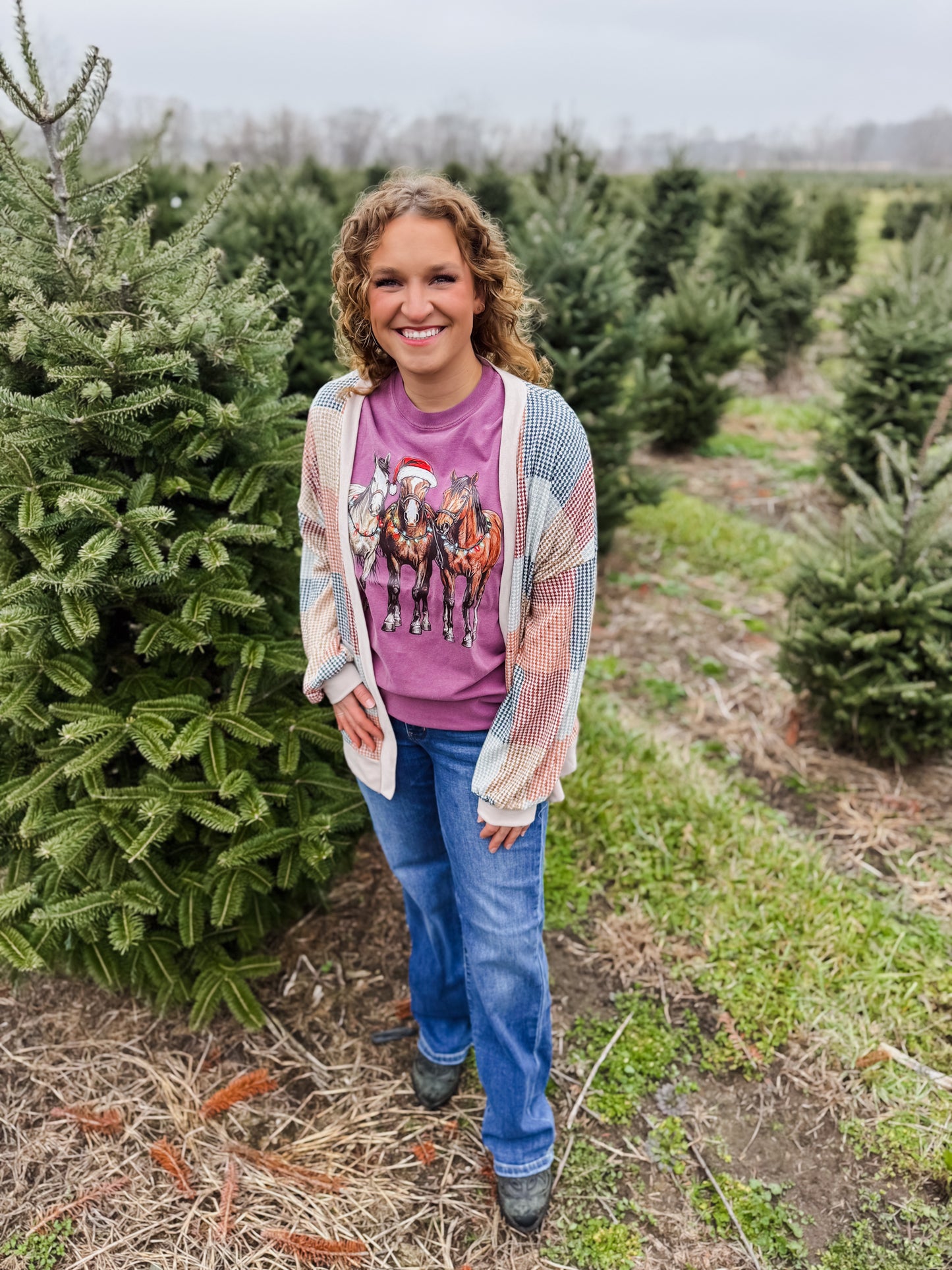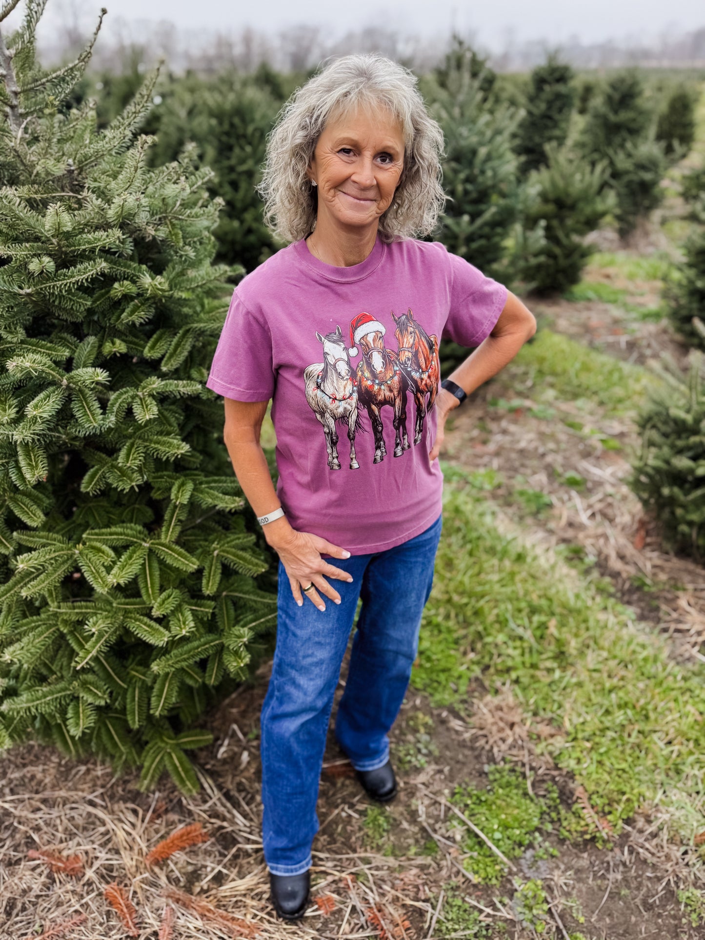 Saddle up for the cutest Christmas style with this festive horse graphic tee! Featuring three beautifully drawn horses — one rocking a Santa hat — this tee brings together western charm and holiday cheer in the most fun way. The soft, relaxed fit makes it perfect for layering under shackets, flannels, or cozy cardigans. Whether you’re a horse lover, a western girl at heart, or just want a unique Christmas graphic, this tee is guaranteed to be a favorite all season long.