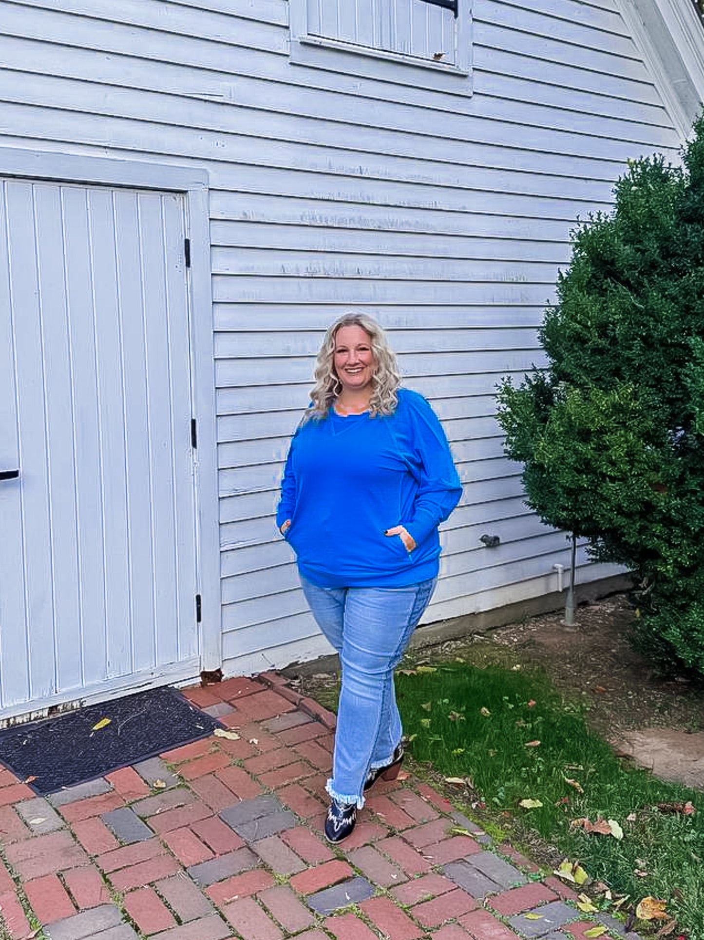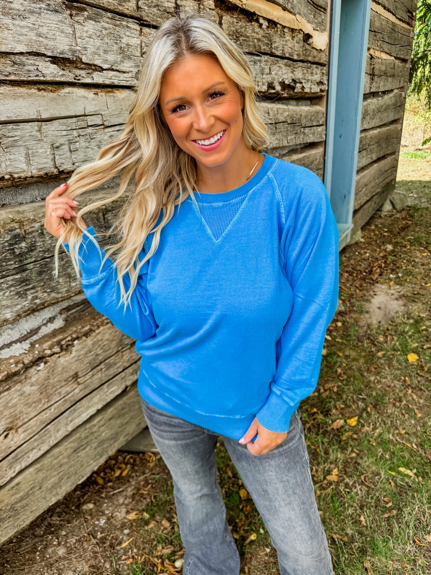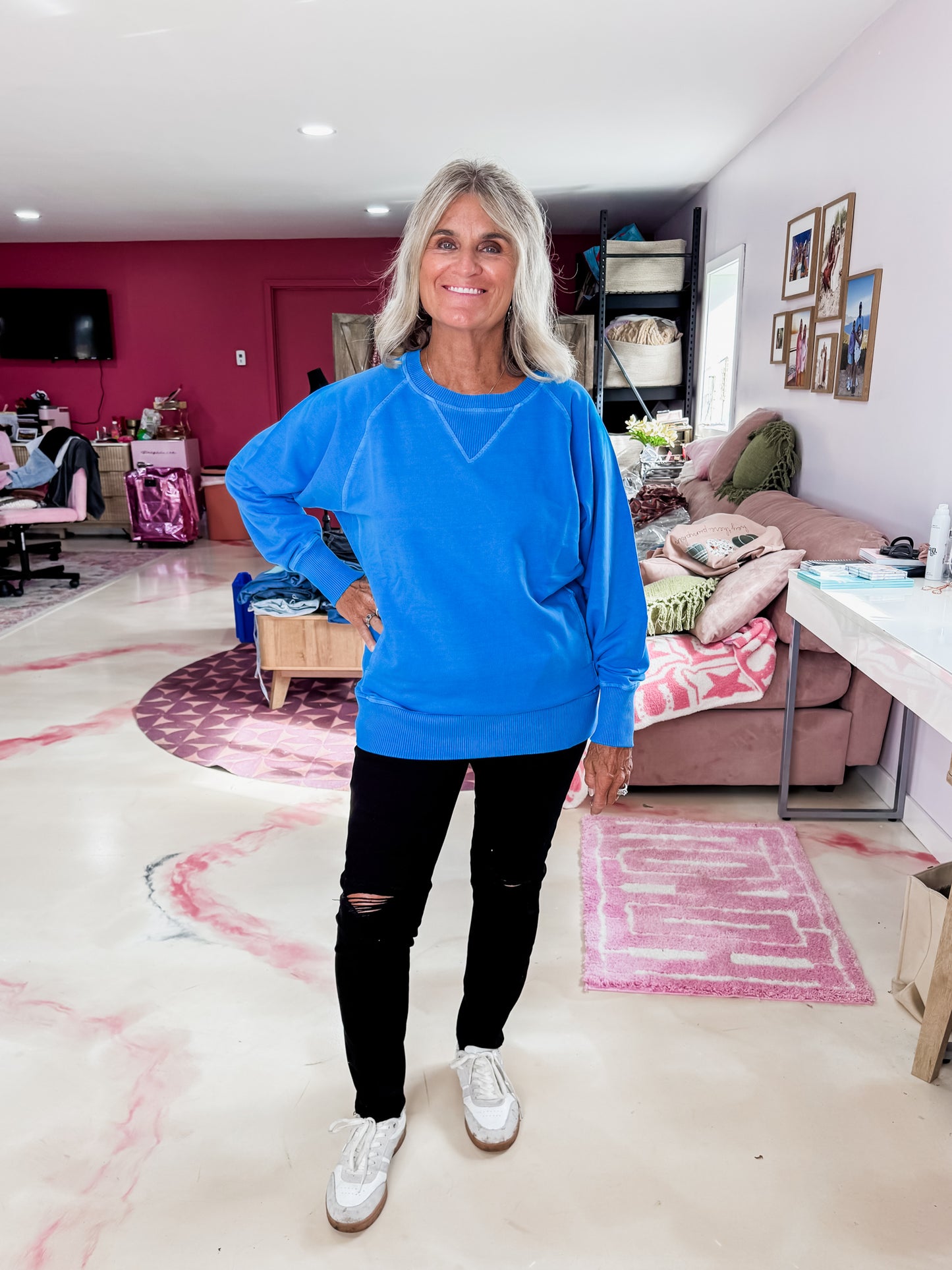 Meet your new favorite chill-day staple š This ocean-blue pullover brings the perfect mix of casual and cute ā relaxed fit, soft fabric, and pockets (because we love practical). Dress it down for errands or style it up for your next coffee run.