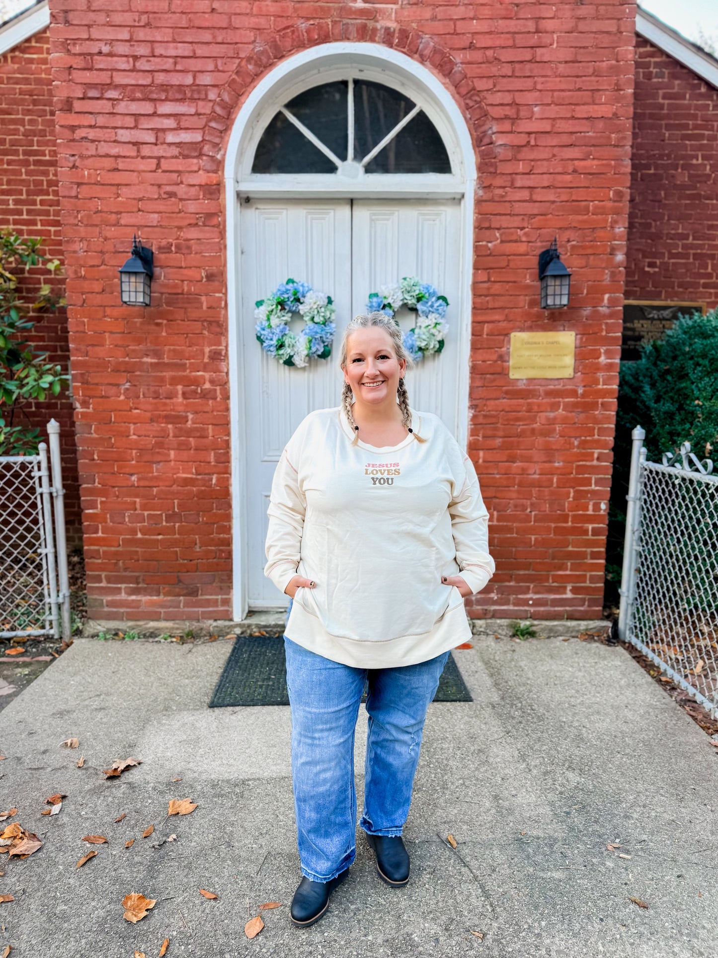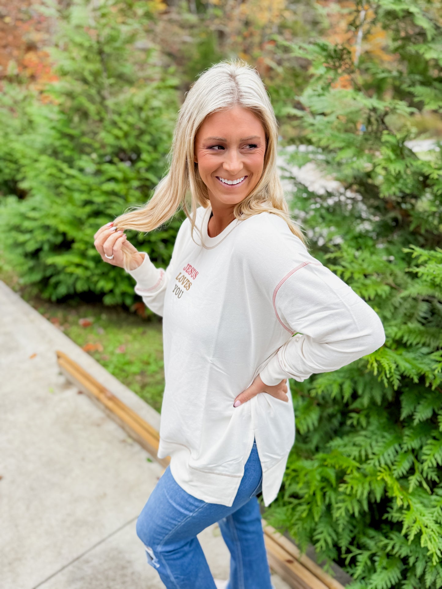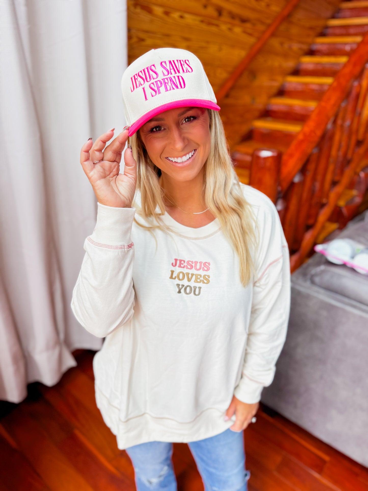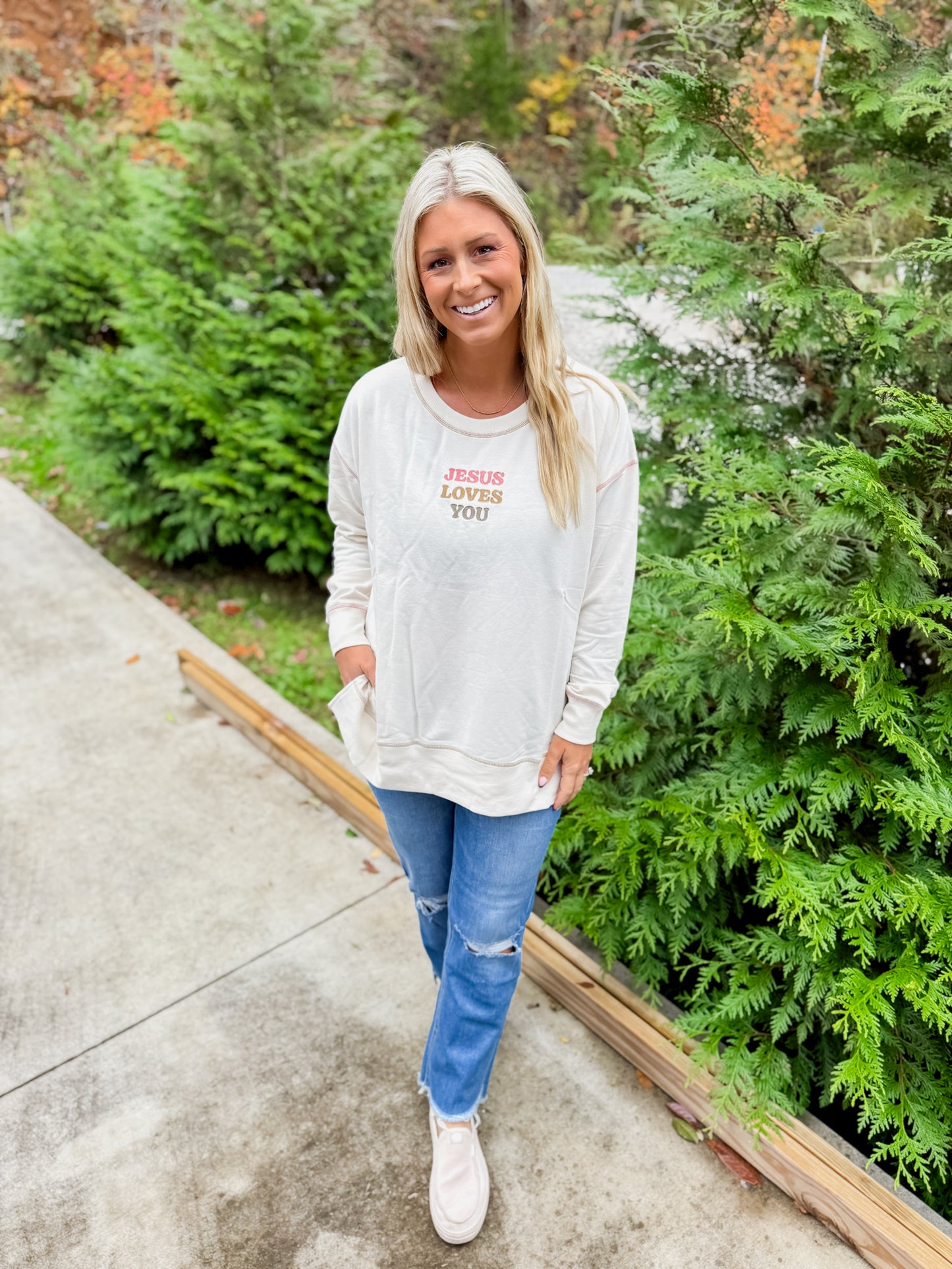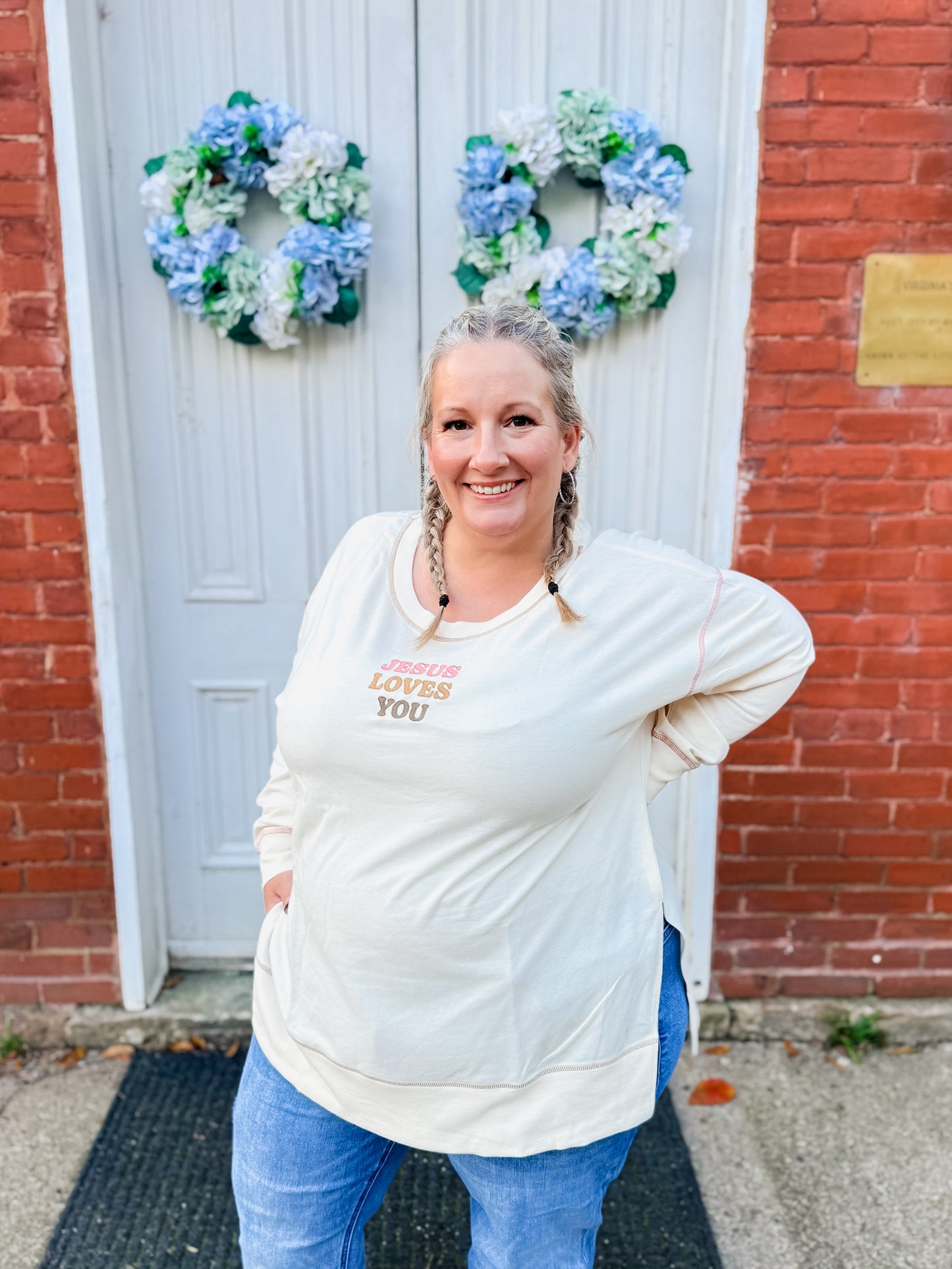 A soft reminder of love and grace, wrapped up in the comfiest crewneck you’ll ever wear. Our “Jesus Loves You” Crewneck features a relaxed fit, subtle neutral tone, and uplifting embroidery that pairs perfectly with your favorite jeans or leggings. Whether you’re running errands, sipping coffee on the porch, or heading to church, this one keeps your heart and style in the right place!