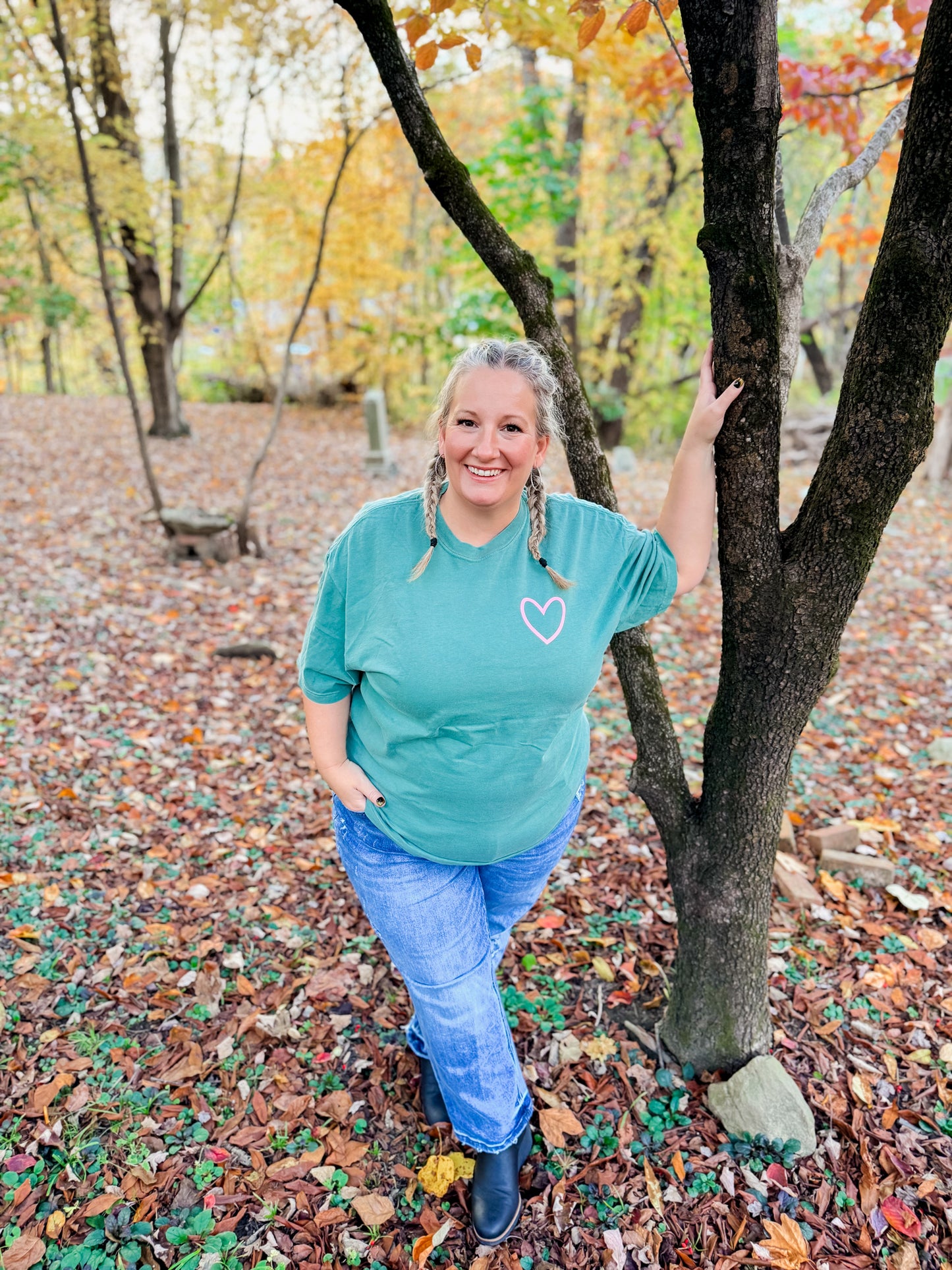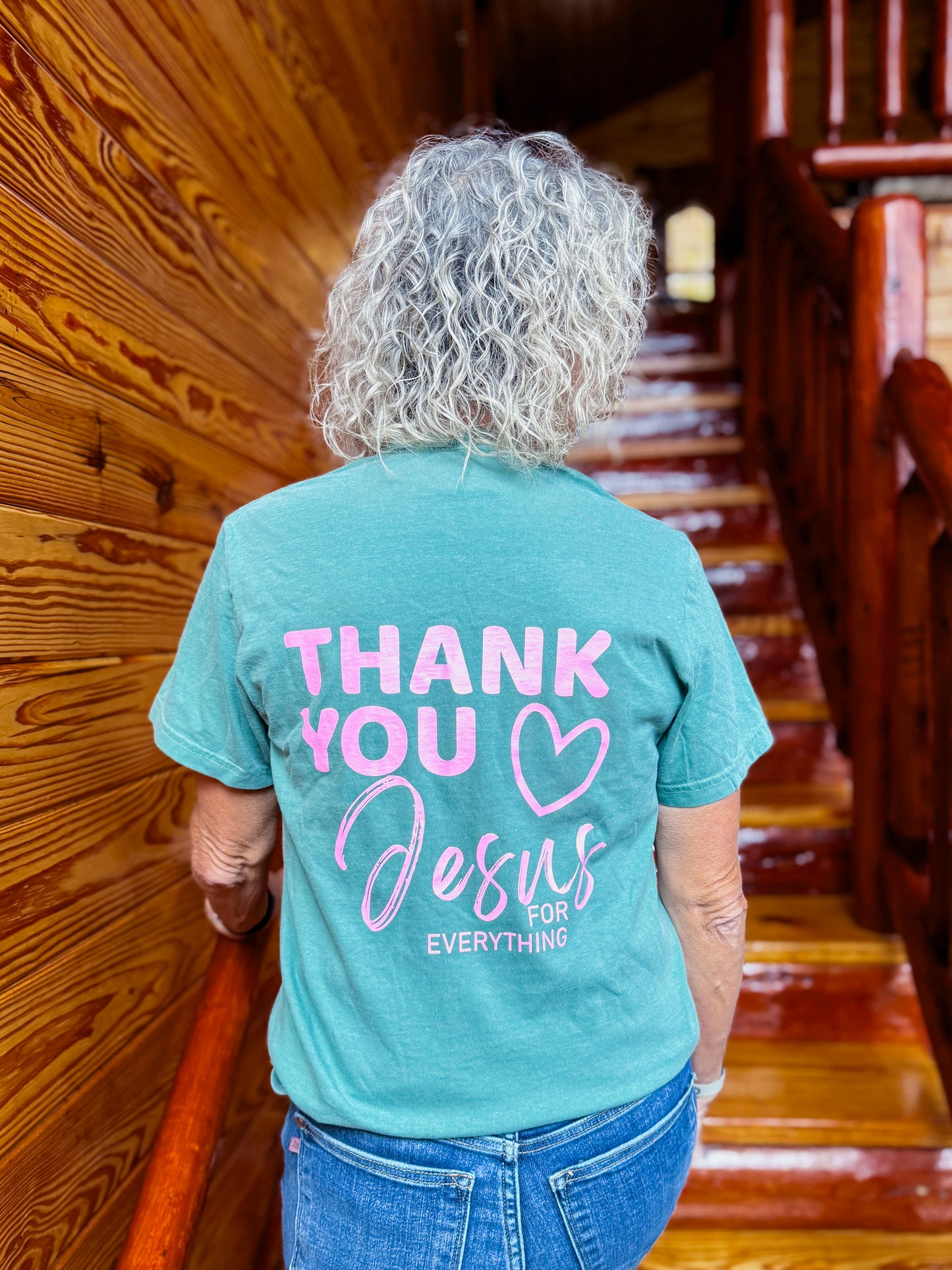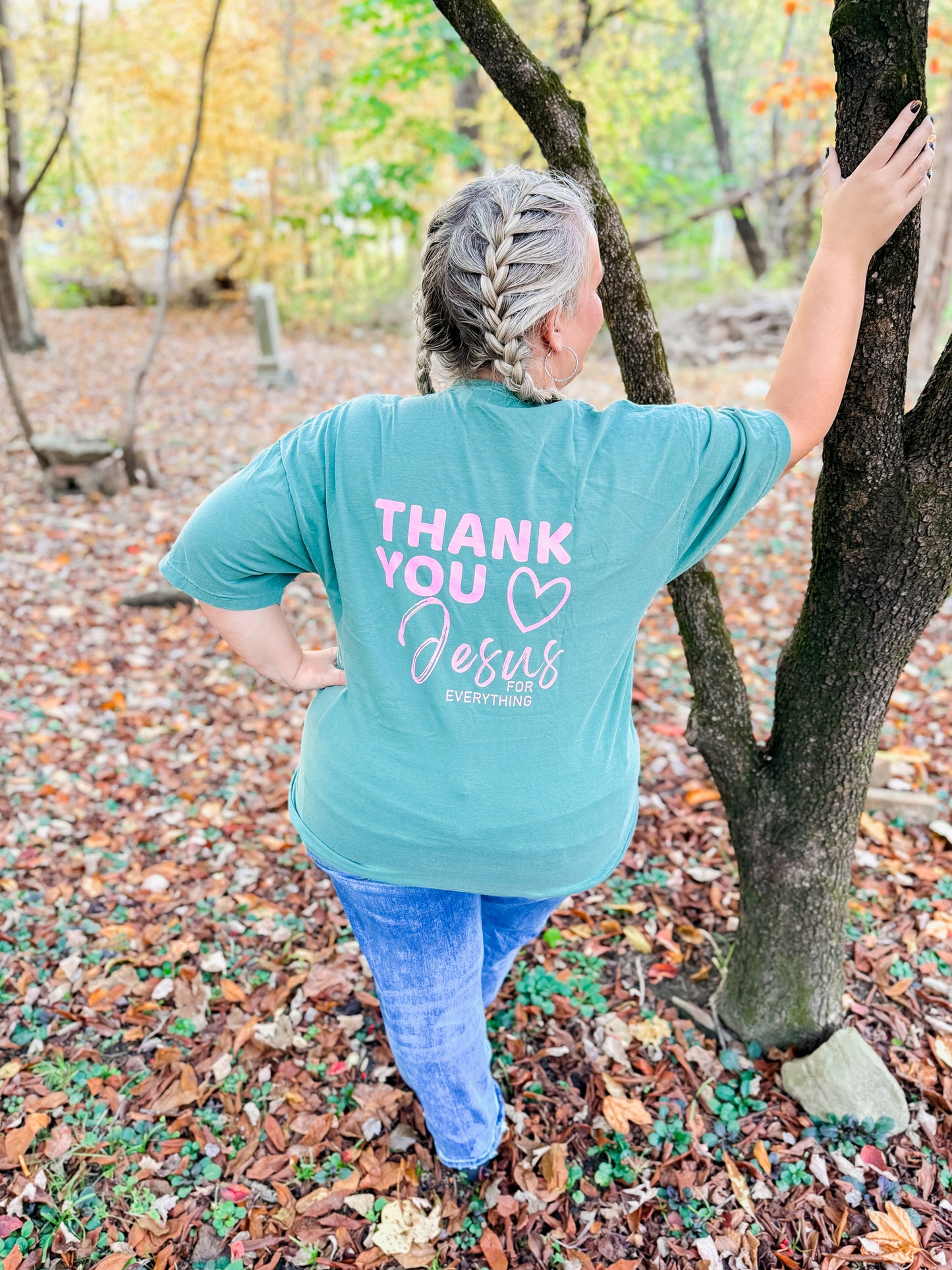 Grateful hearts only ๐ This teal tee with pink lettering says it best โ Thank You Jesus for everything! Cozy, faith-filled, and easy to style, itโs the perfect everyday reminder to lead with gratitude and joy!