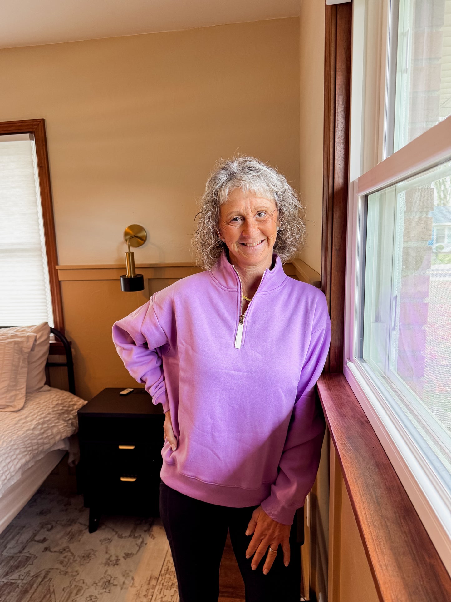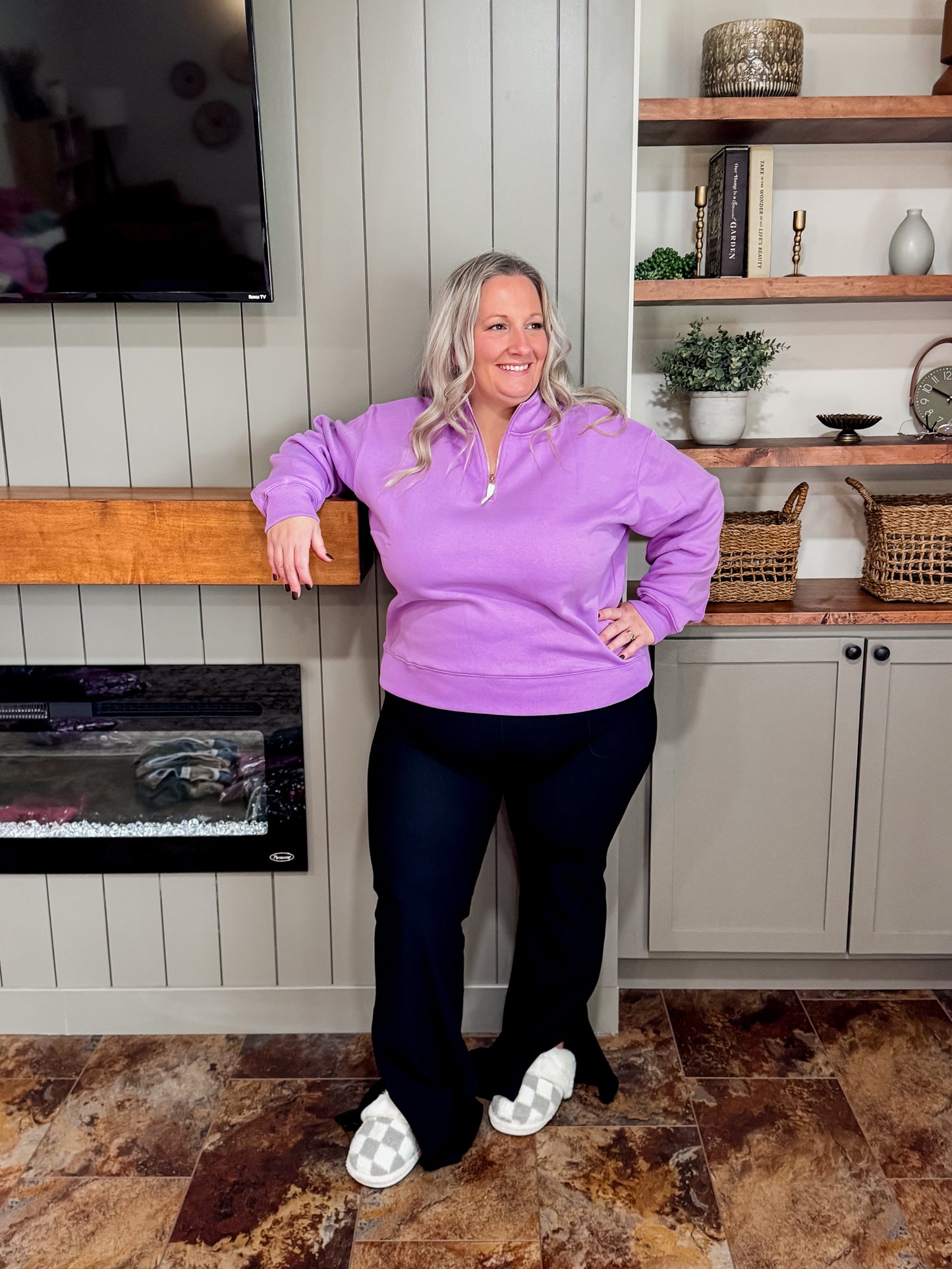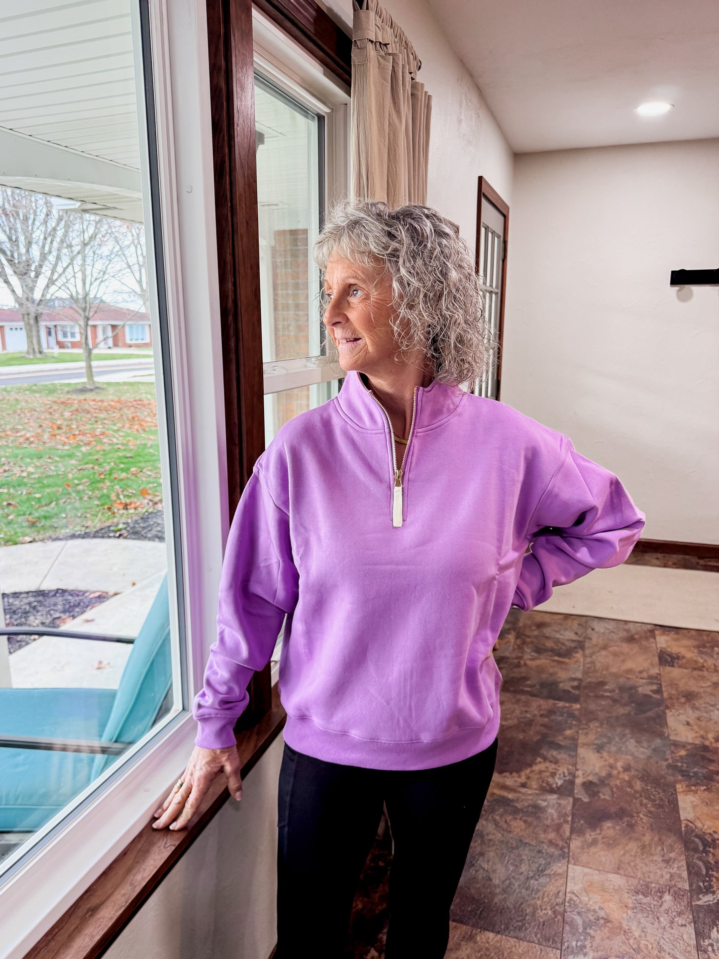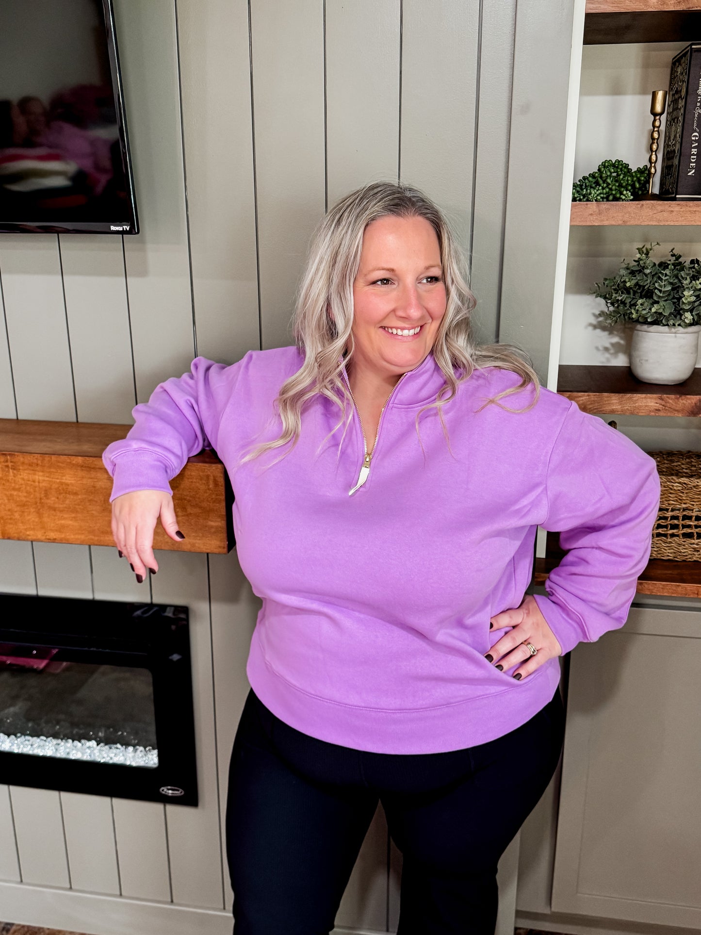 Fresh, cozy, and full of color — this lavender quarter-zip is the perfect throw-on layer for any season. The soft fleece interior keeps you warm and comfy, while the zip-up neckline adds that sporty, easygoing touch. With its relaxed fit and ribbed trim, it’s the perfect mix of cute and casual.