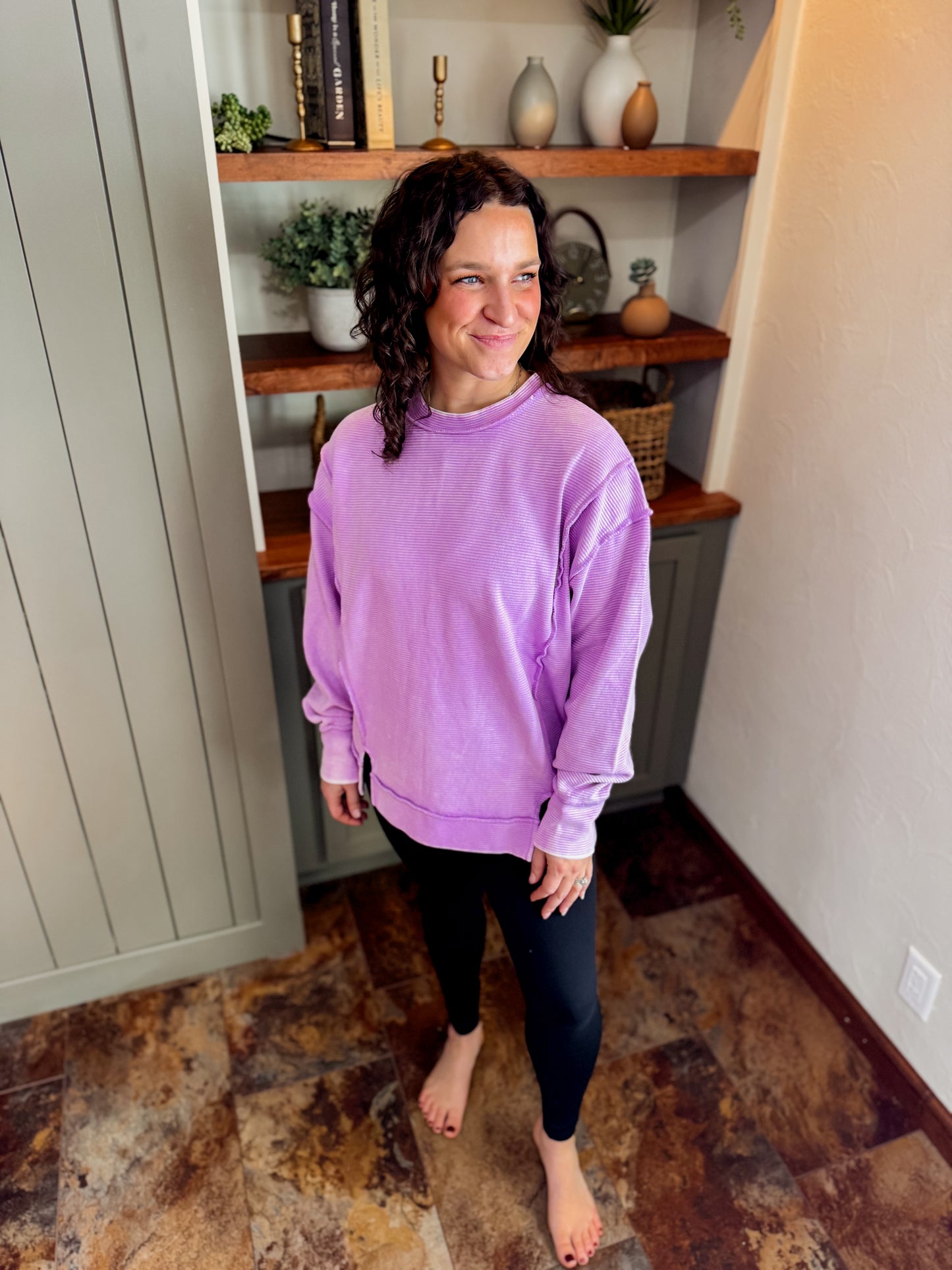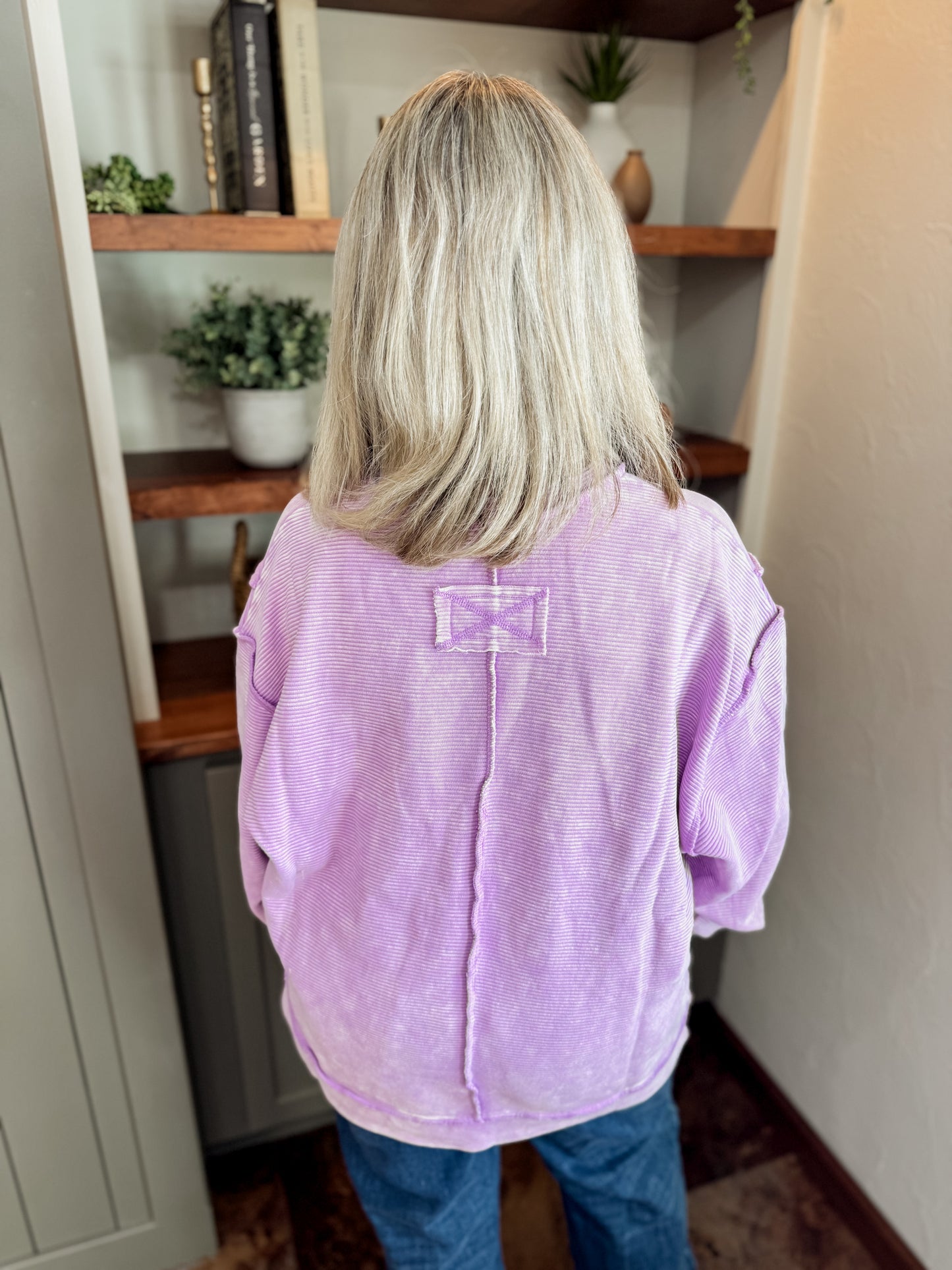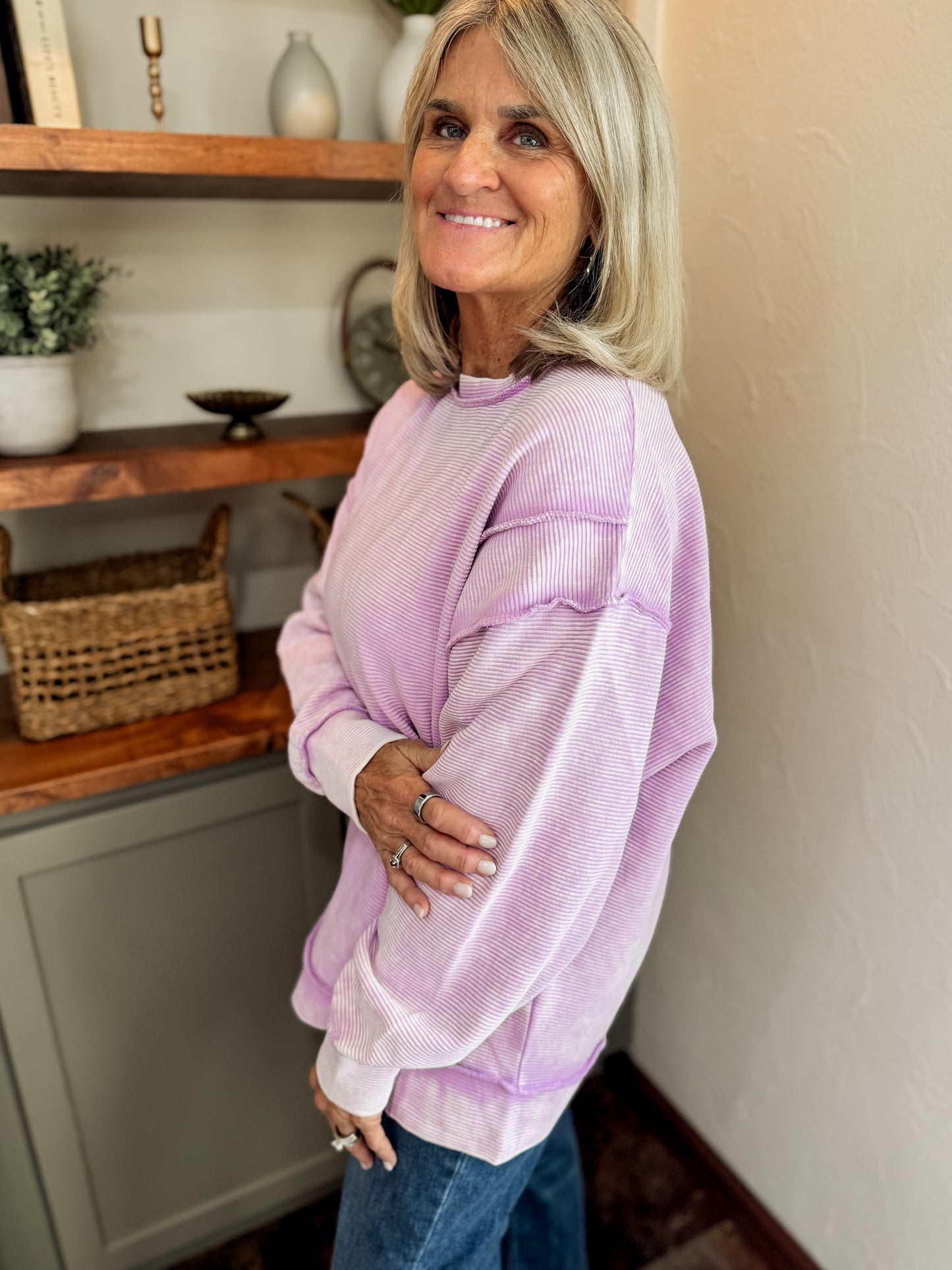 The Lavender Calico Crew is soft, lightweight, and perfectly relaxed for those throw-on-and-go days. Featuring a subtle ribbed texture, dropped shoulders, and a lived-in lavender wash, this pullover delivers cozy comfort without feeling bulky. Easy to dress up with denim or keep casual with leggings.