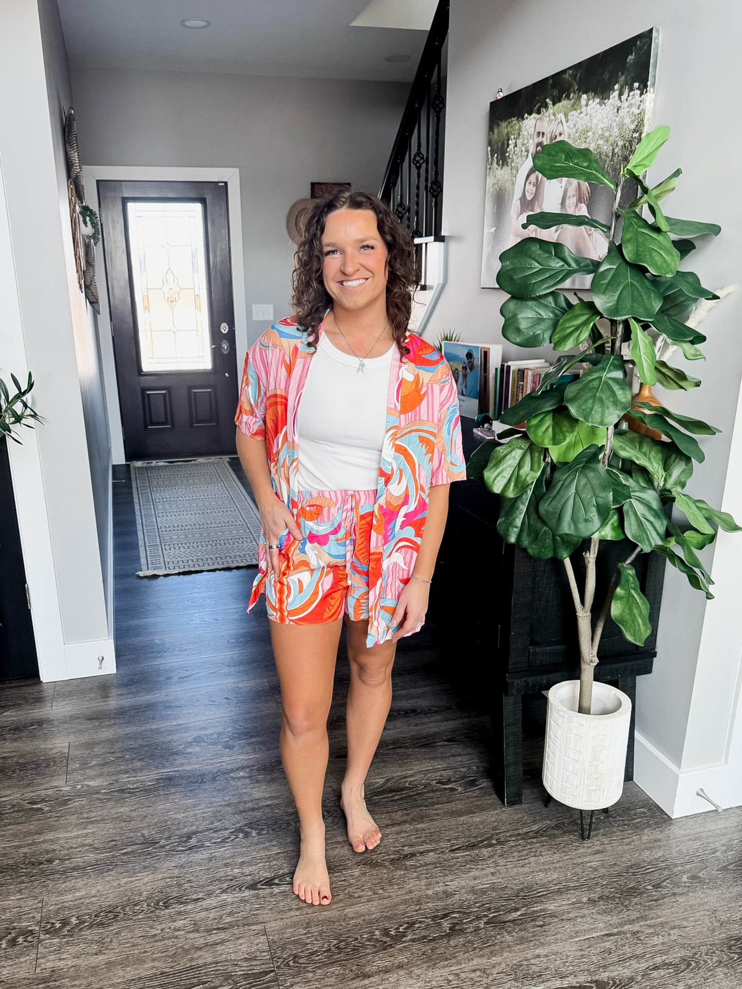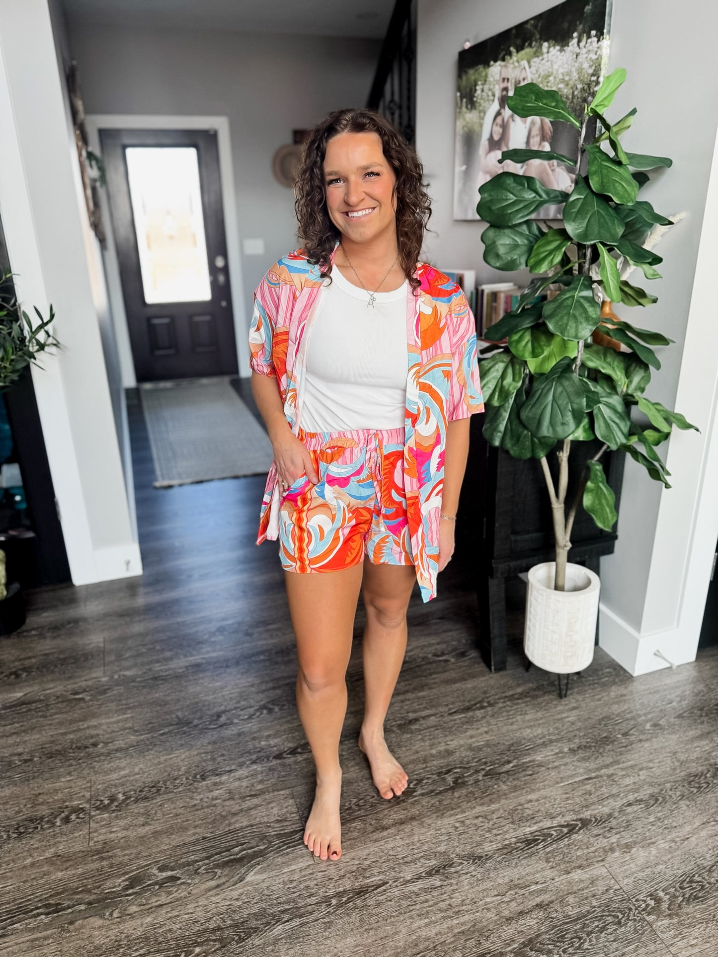 Bold, breezy, and made for sunny escapes, the Sunset Palms Two-Piece Set is your go-to for effortless vacation style. Featuring a lightweight open-front top and matching elastic-waist shorts, this set pops with a vibrant mix of pinks, oranges, and playful abstract stripes. Easy to wear and full of personality, it’s perfect for poolside lounging, weekend getaways, or casual days when you want to stand out.