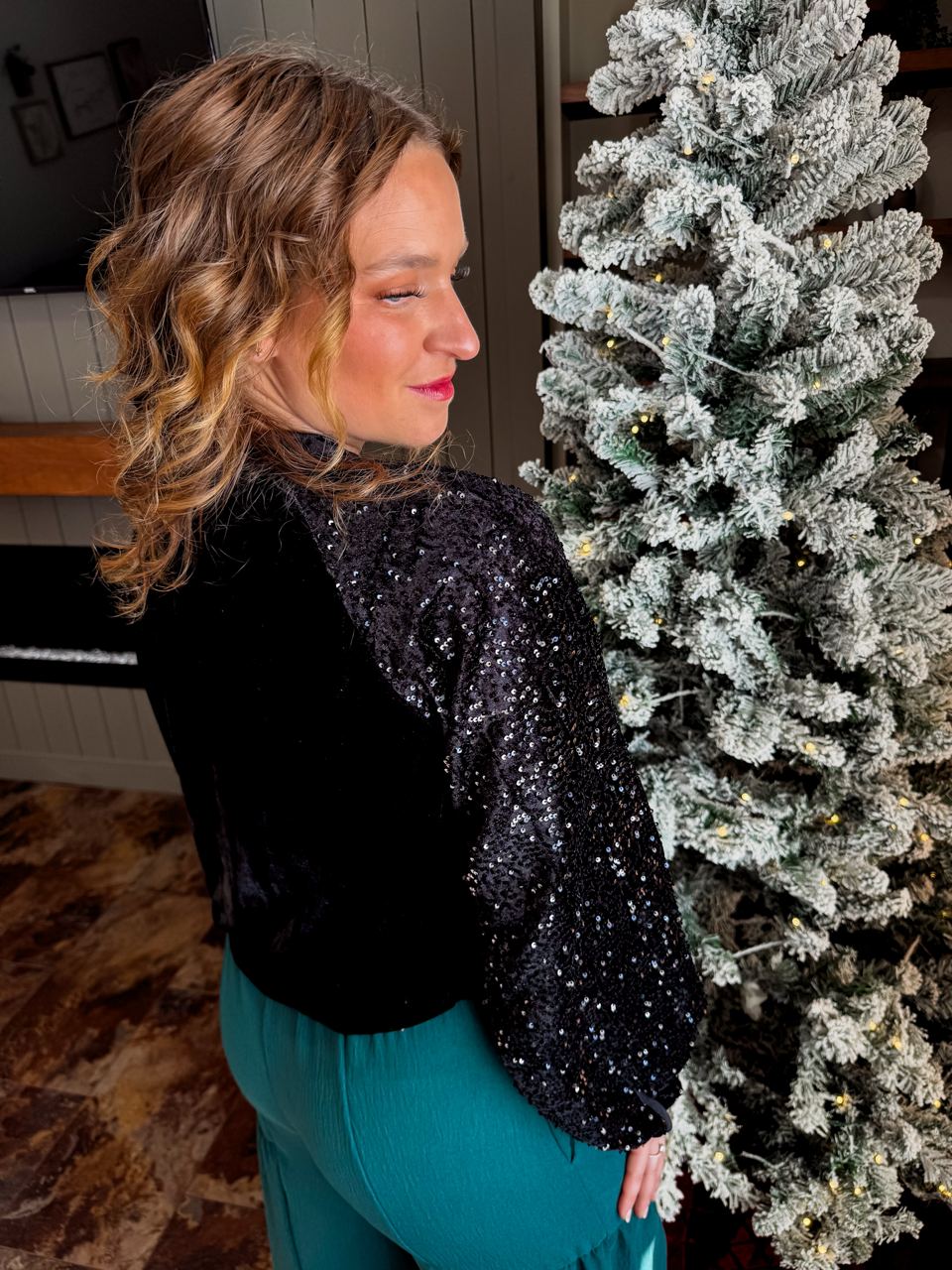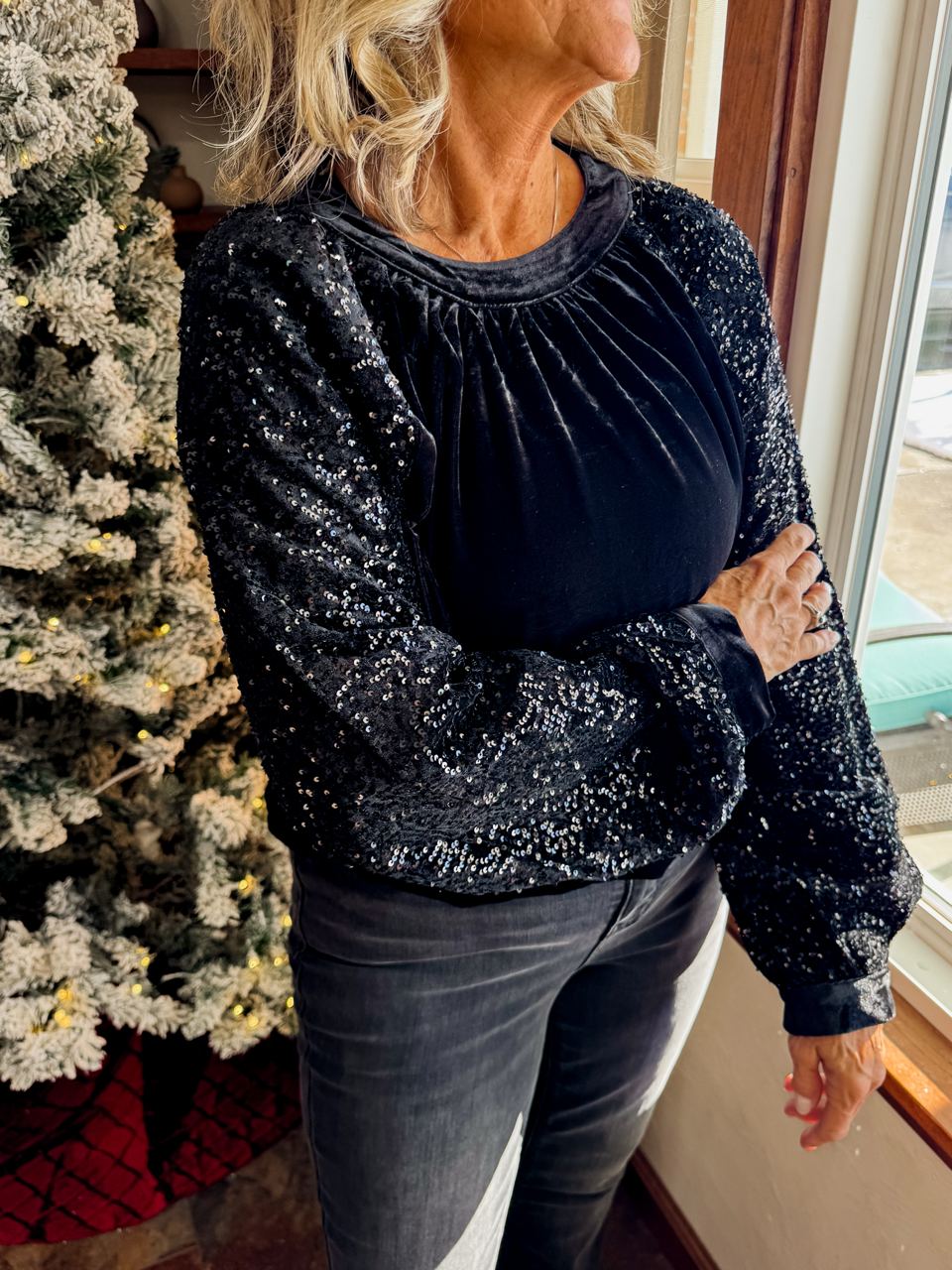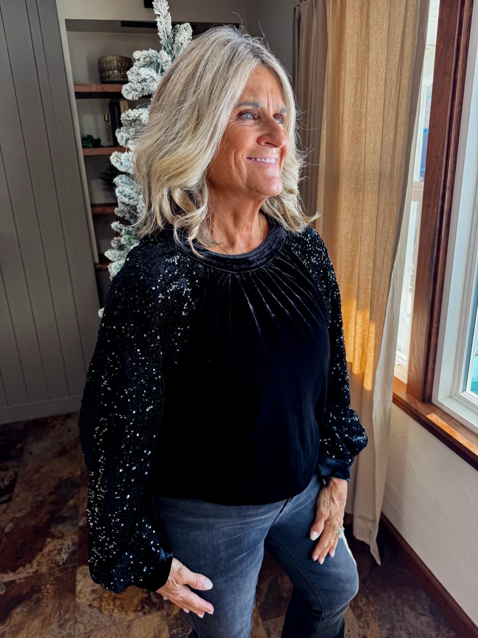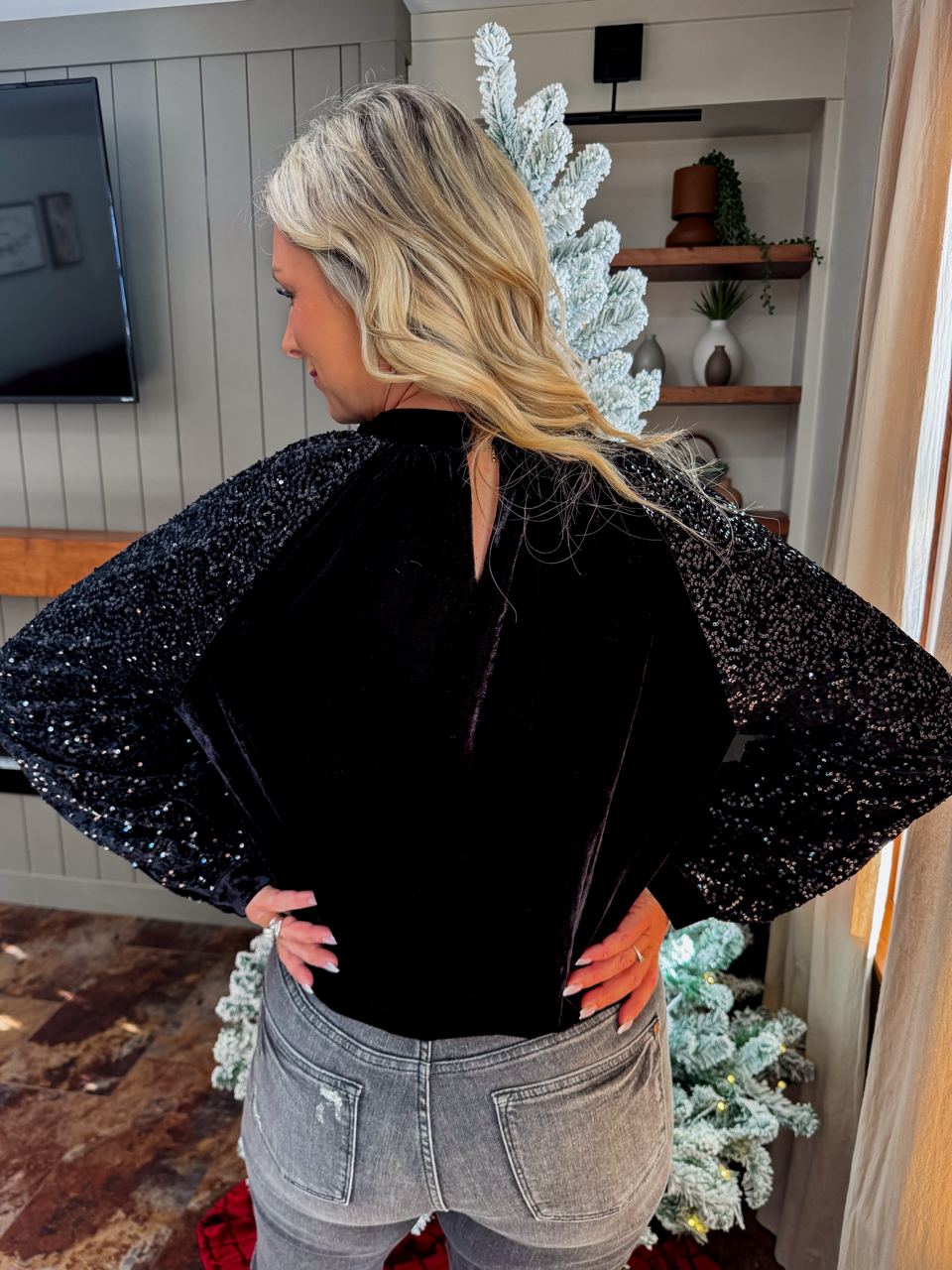 The Black Velvet Sequin Top is your go-to glam moment this season. Rich black velvet meets shimmering sequin sleeves, creating a top that feels luxe, festive, and effortlessly chic. The gathered neckline adds an elevated touch, while the soft velvet body keeps it comfortable enough for all-night wear. Pair it with satin trousers, denim, or a skirt — no matter how you style it, it brings instant wow.