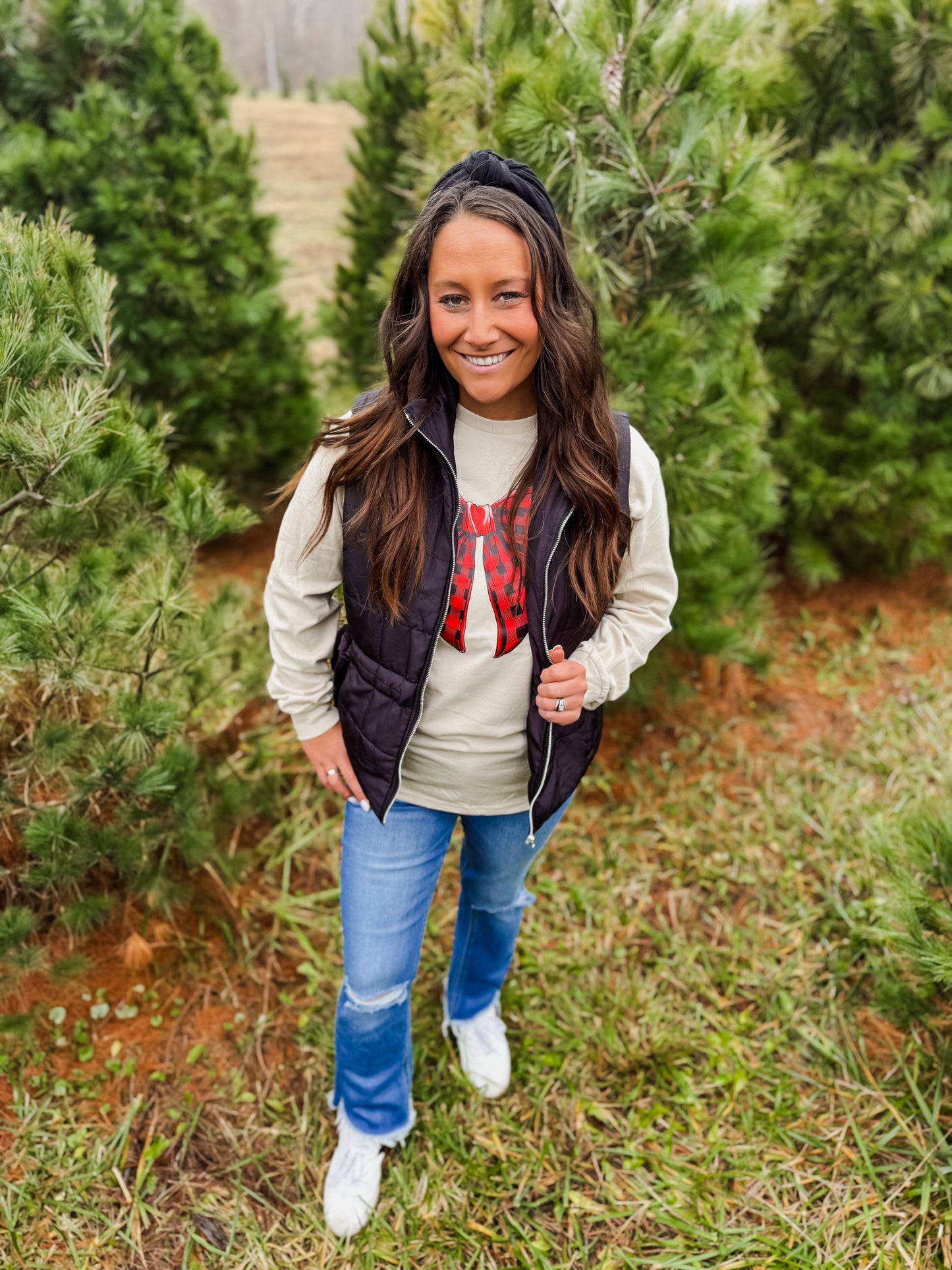Cute, cozy, and perfectly festive — this buffalo plaid bow sweatshirt is everything you need for the holiday season! The bold red-and-black bow graphic gives that “wrapped like a present” vibe, while the soft, relaxed fit keeps you comfy from cookie baking to Christmas movie marathons. Pair it with leggings or denim for an easy, festive look you’ll reach for again and again. Sweet, simple, and so much fun — this is the holiday graphic of the year!