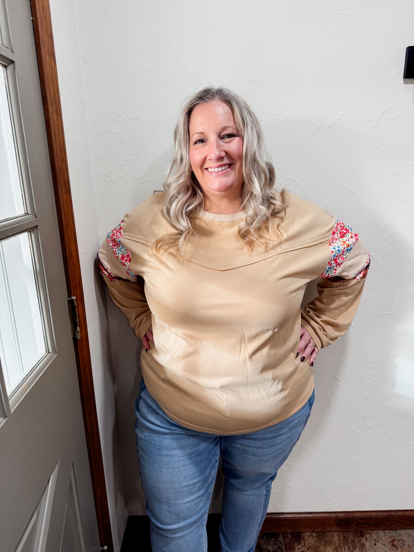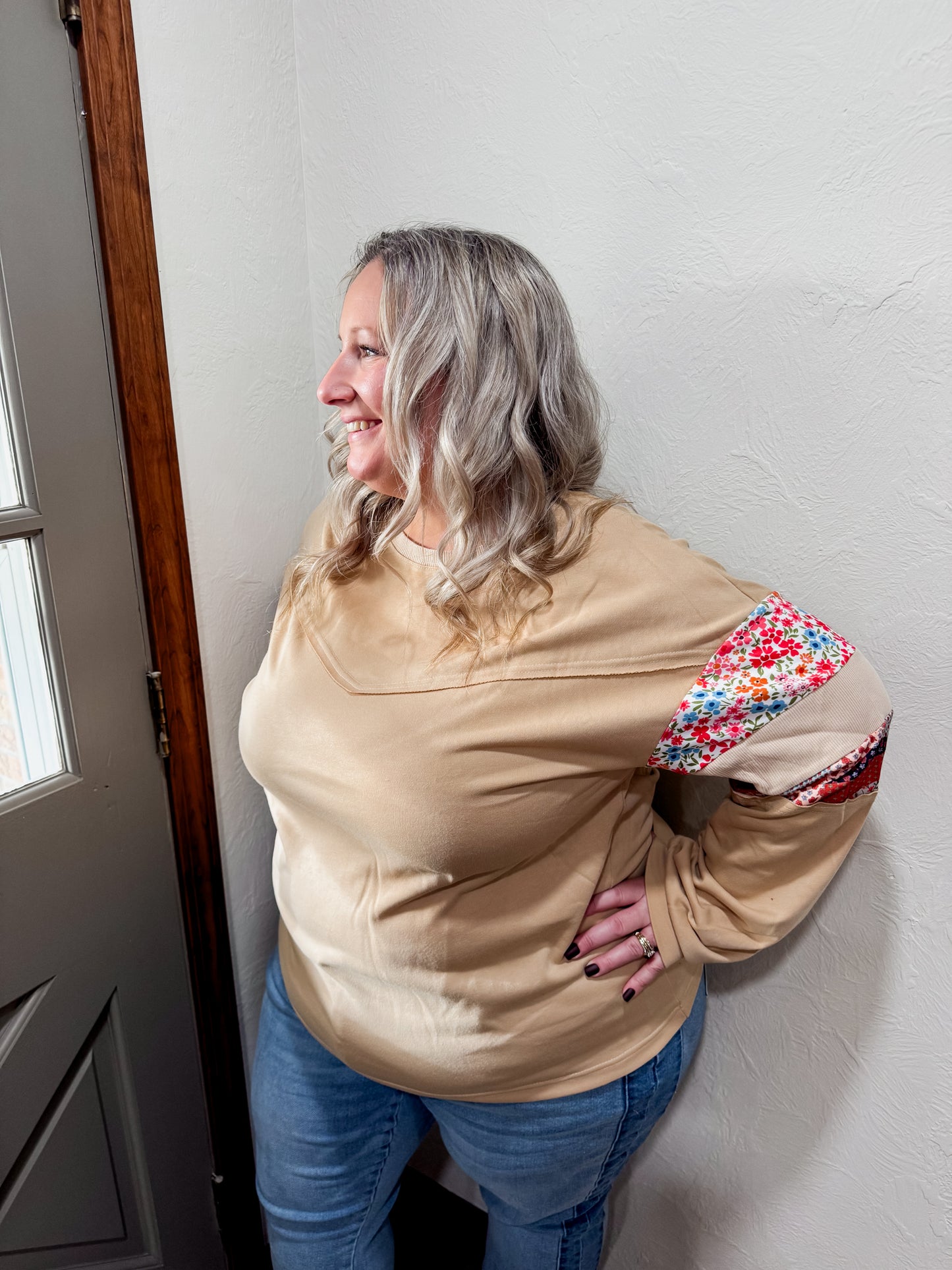 Embrace cozy charm with this playful top featuring a relaxed fit and long sleeves. The khaki color base comes alive with a fun mix of patterns on the sleeves, adding a splash of personality! With a comfy round neck and trendy raw seam details, this oversized top is your go-to for effortless style and all-day comfort!
