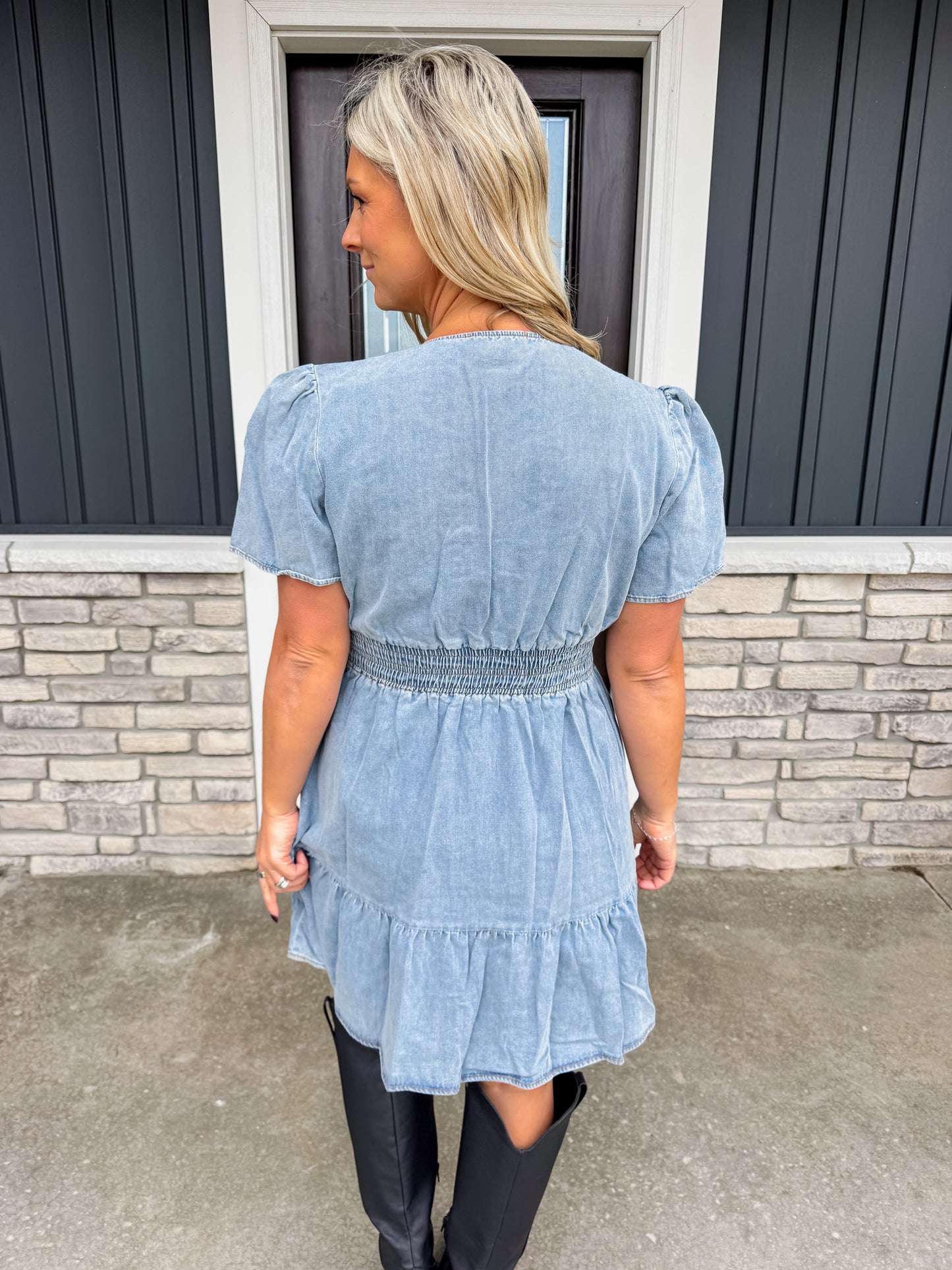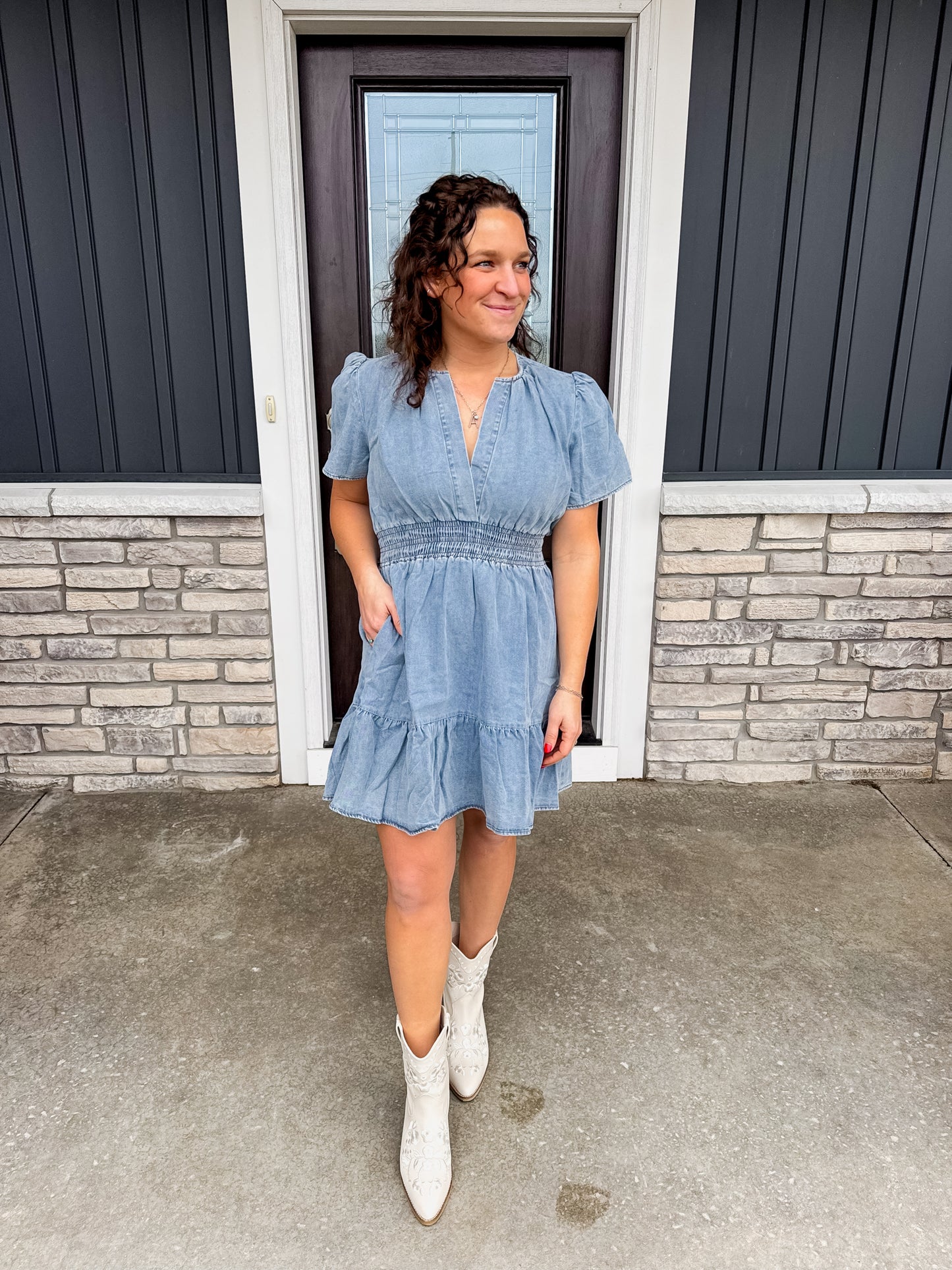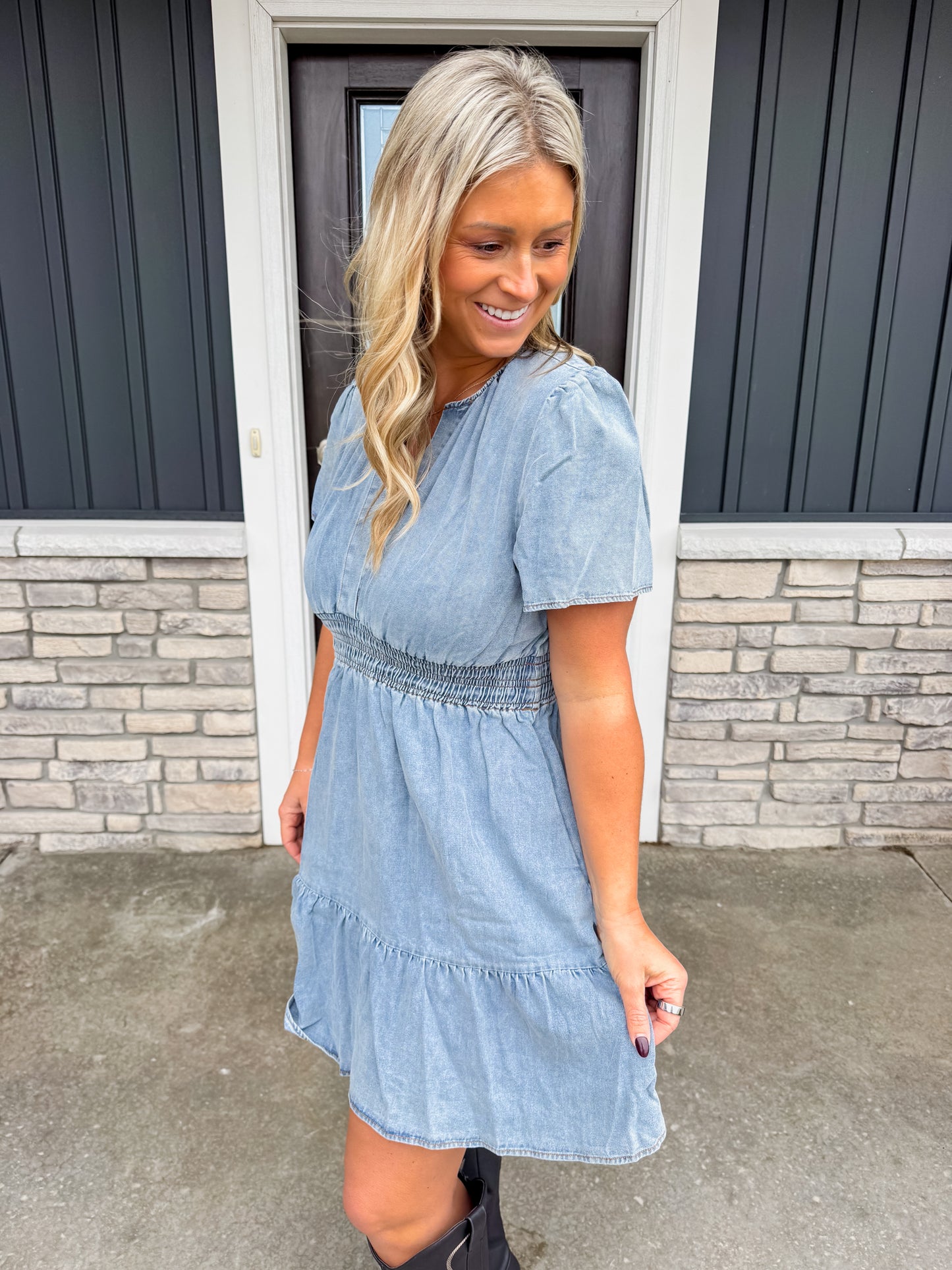 Easy, flattering, and effortlessly cute—the Lover Denim Dress is that throw-on-and-go piece you’ll reach for all season long. With its soft denim wash, smocked waist, and tiered skirt, this dress gives you shape without sacrificing comfort. Dress it up with boots or keep it casual with sneakers—either way, it’s a total win.