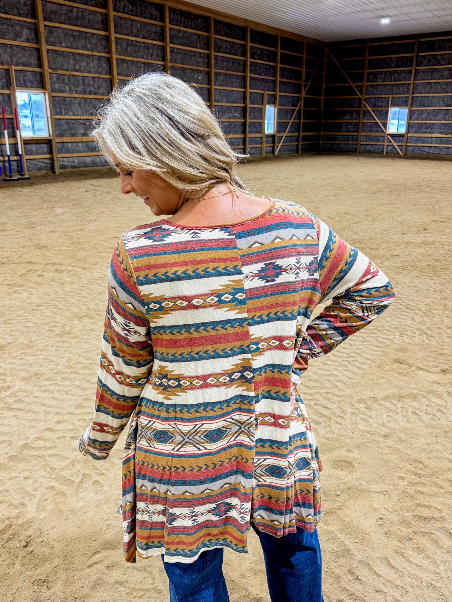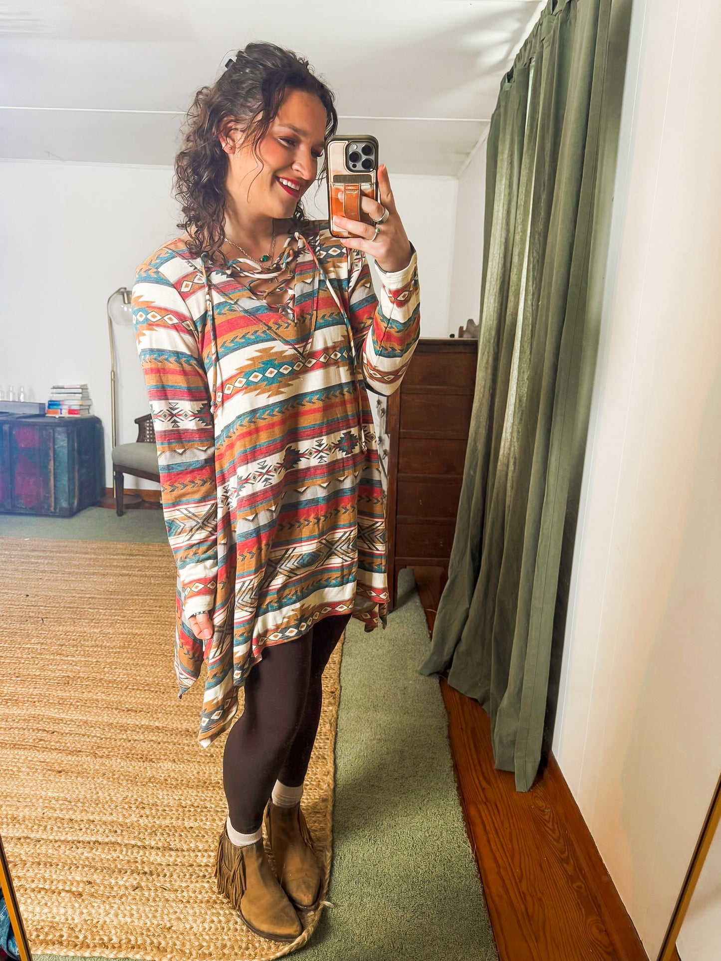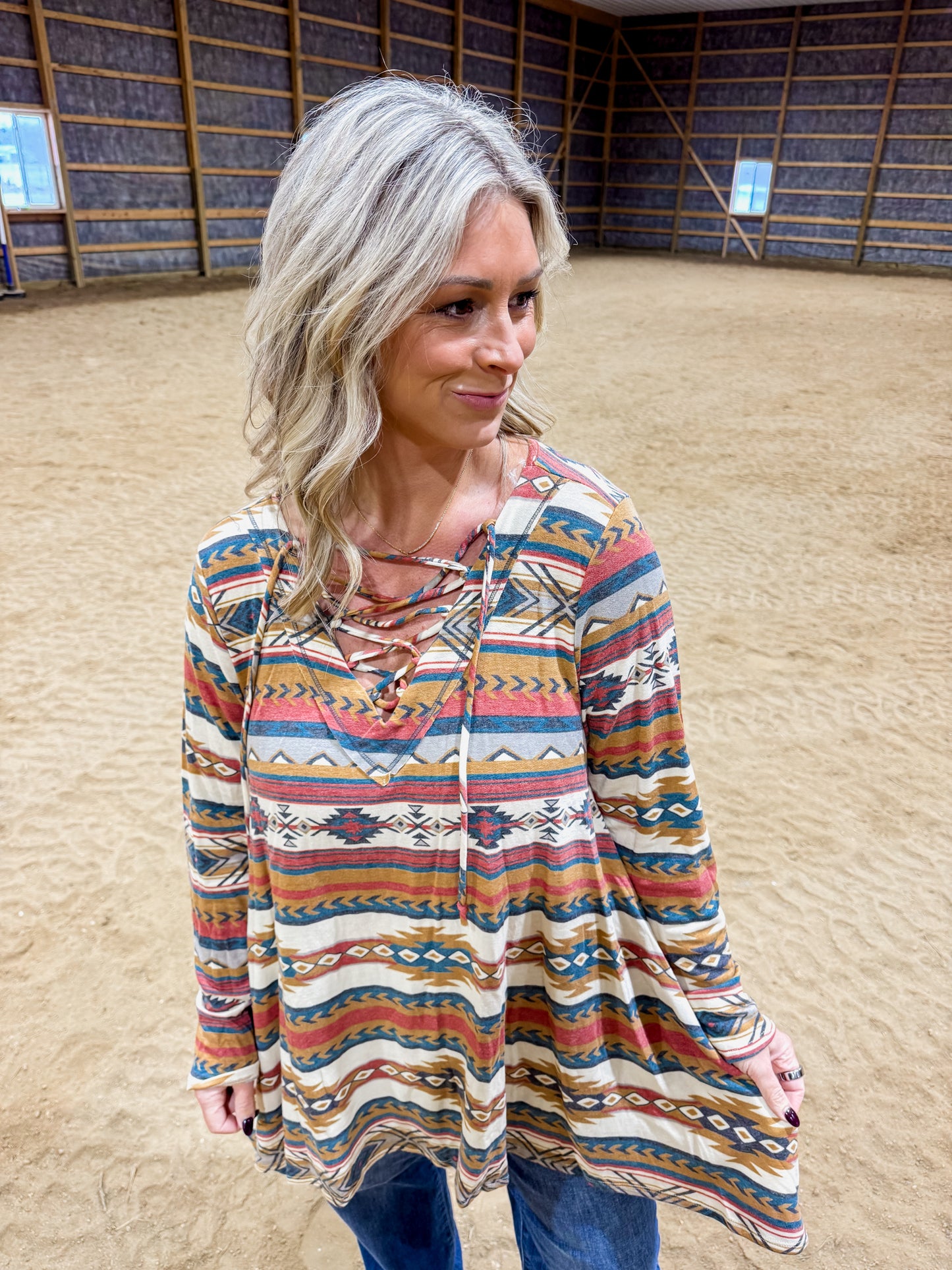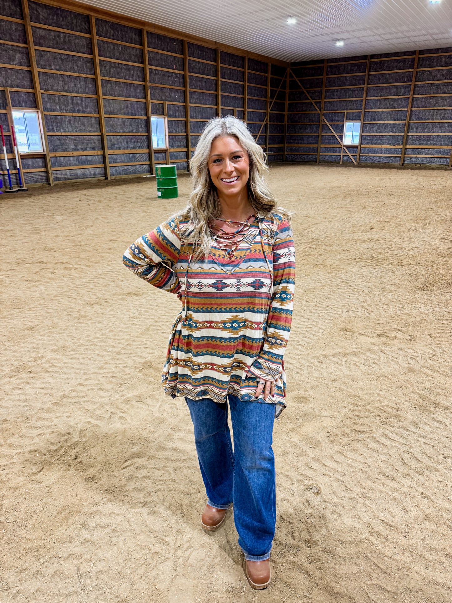 Regular price $24.00Effortlessly boho with a touch of western soul, the Sundance Stripe Lace-Up Tunic is a statement piece you’ll fall in love with instantly. Featuring a warm-toned Aztec stripe print, a flattering lace-up neckline, and a flowy swing silhouette, this dress is perfect for transitioning seasons and easy everyday styling.