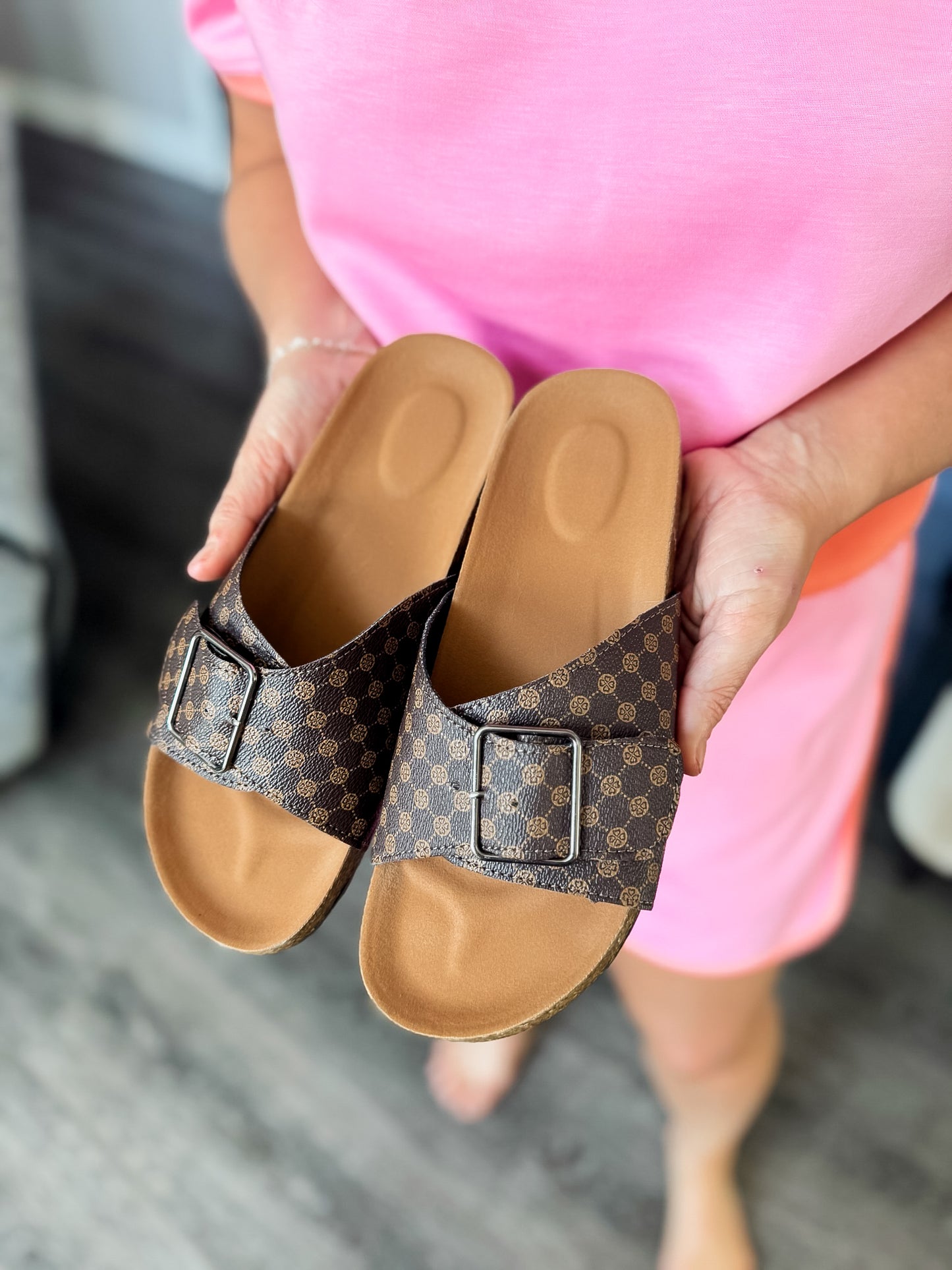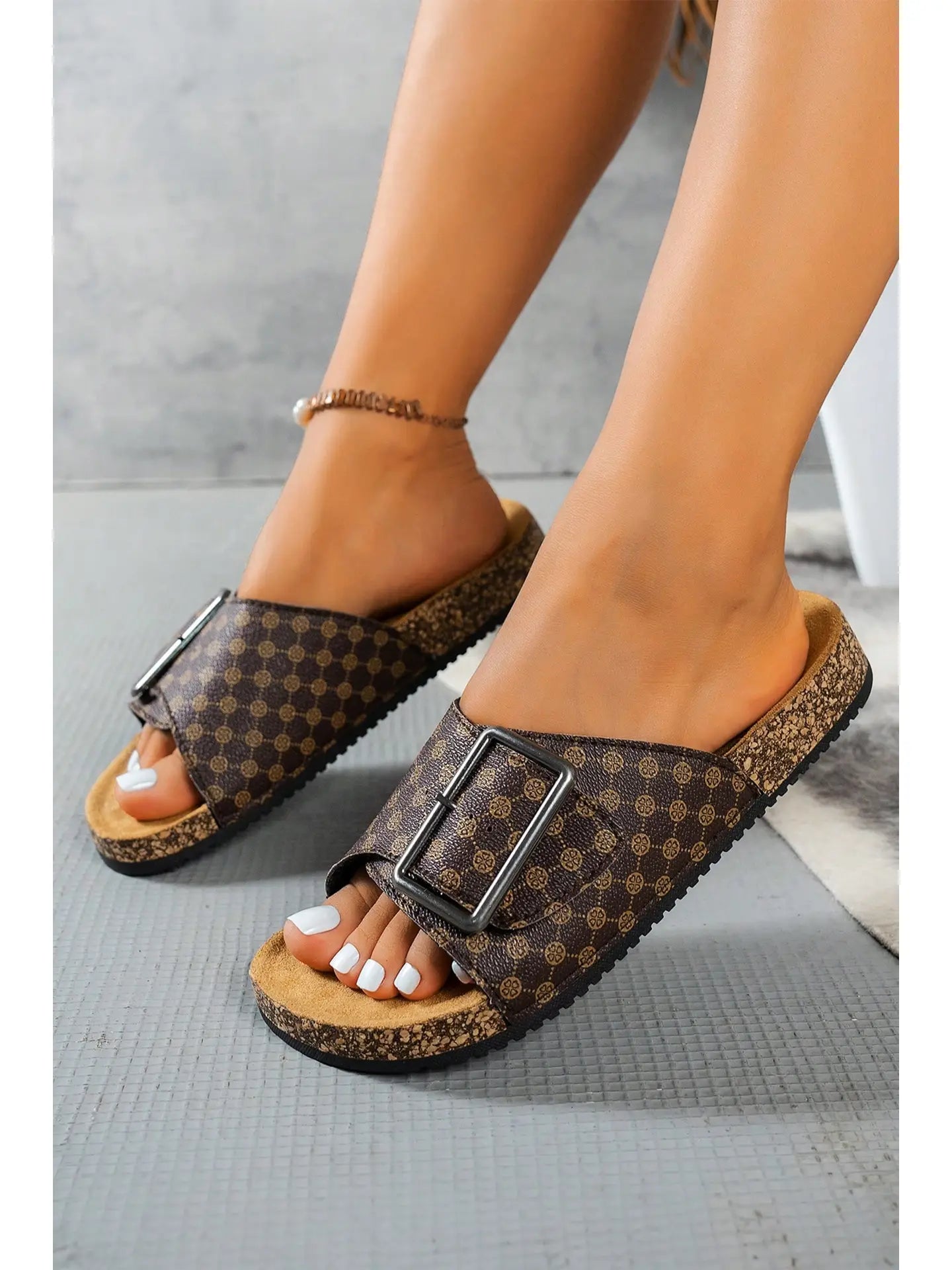 Meet the slide that instantly elevates your everyday look. The Mocha Luxe Buckle Slide features a rich brown designer-inspired print with an oversized statement buckle that gives it that high-end, effortless vibe. The contoured cork footbed keeps things comfy while the textured sole adds just the right amount of grip for all-day wear.
